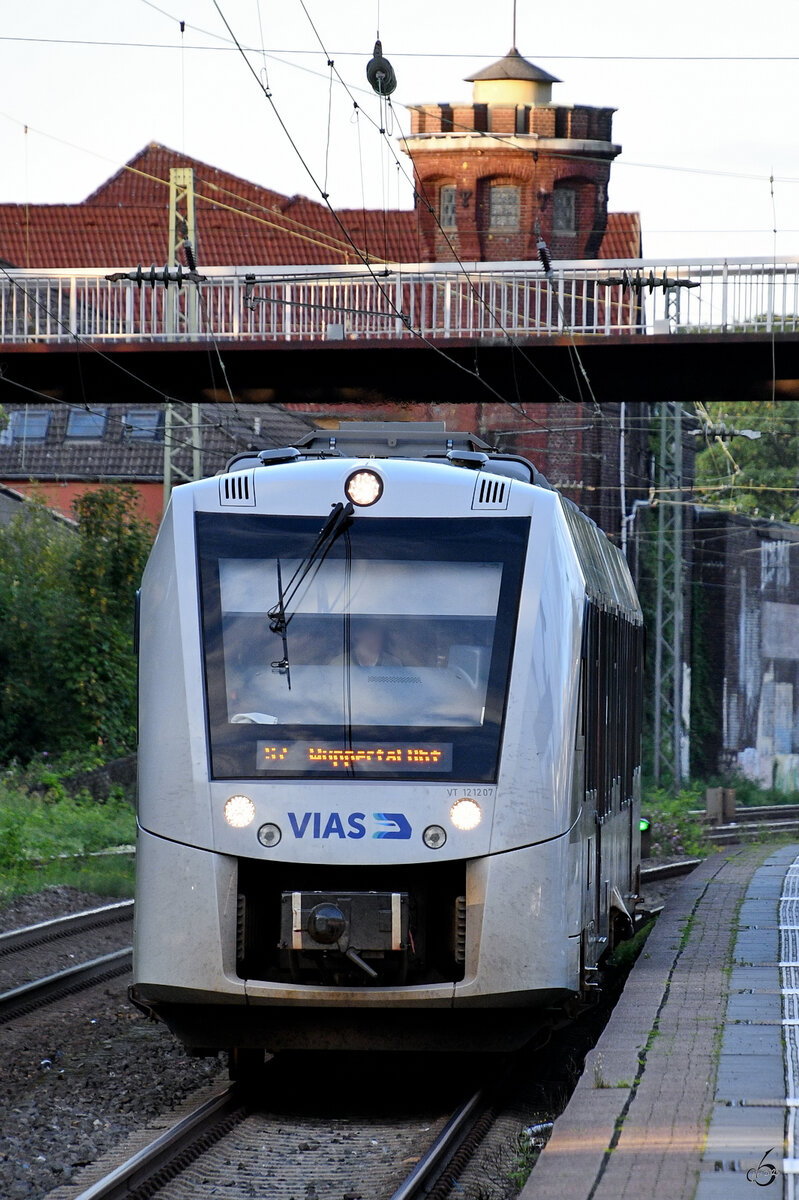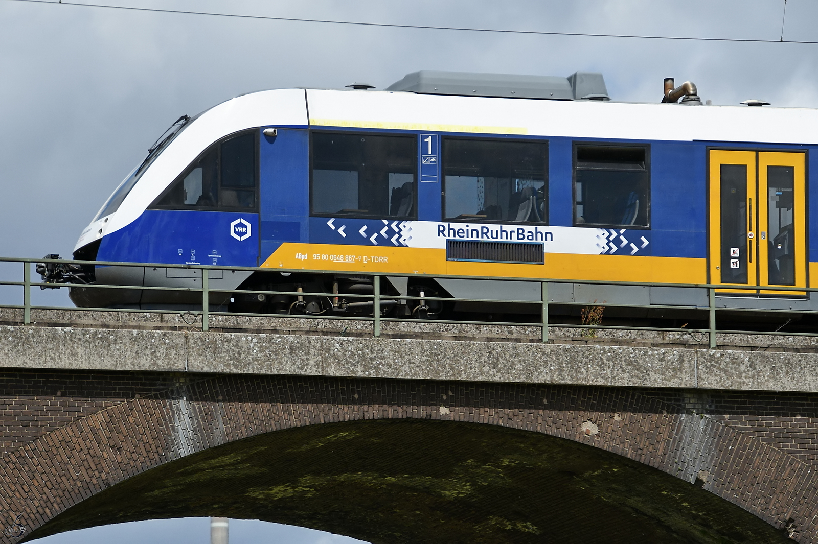 Ende September 2025 wurde auf der Linie RB31 der Dieseltriebzug VT121 (648 006) eingesetzt, hier abgelichtet Duisburg-Hochfelder Eisenbahnbrücke.