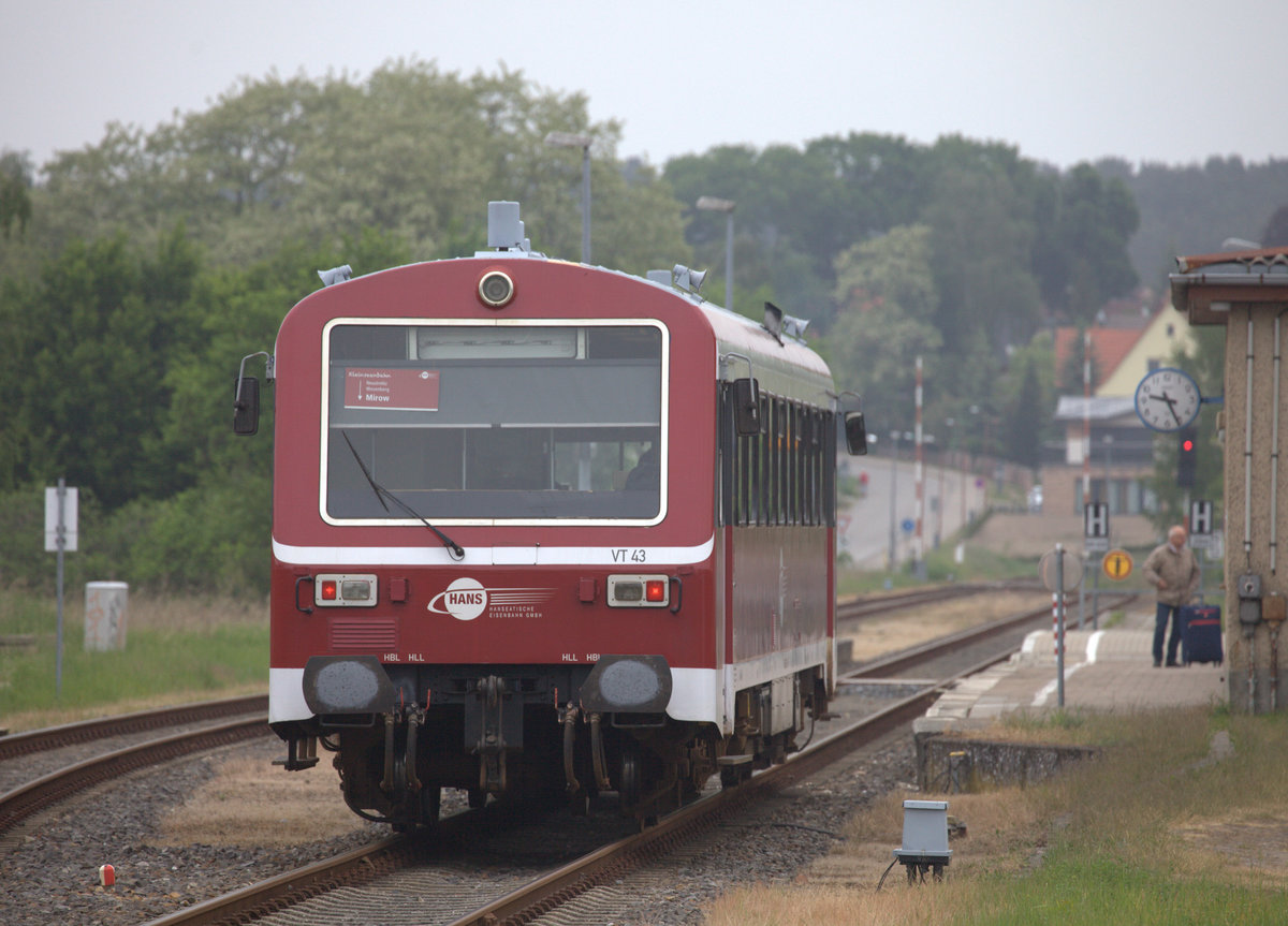 Den von der Mecklenburgischen Südbahn verbliebenen Restbetrieb Waren - Malchow erledigt "der Hans" mit einem einzigen LVT-Umlauf: VT 504 001 (D-EGP) in Waren (Müritz) am Sonntag, 22.7.18. Hermann-Josef Weirich