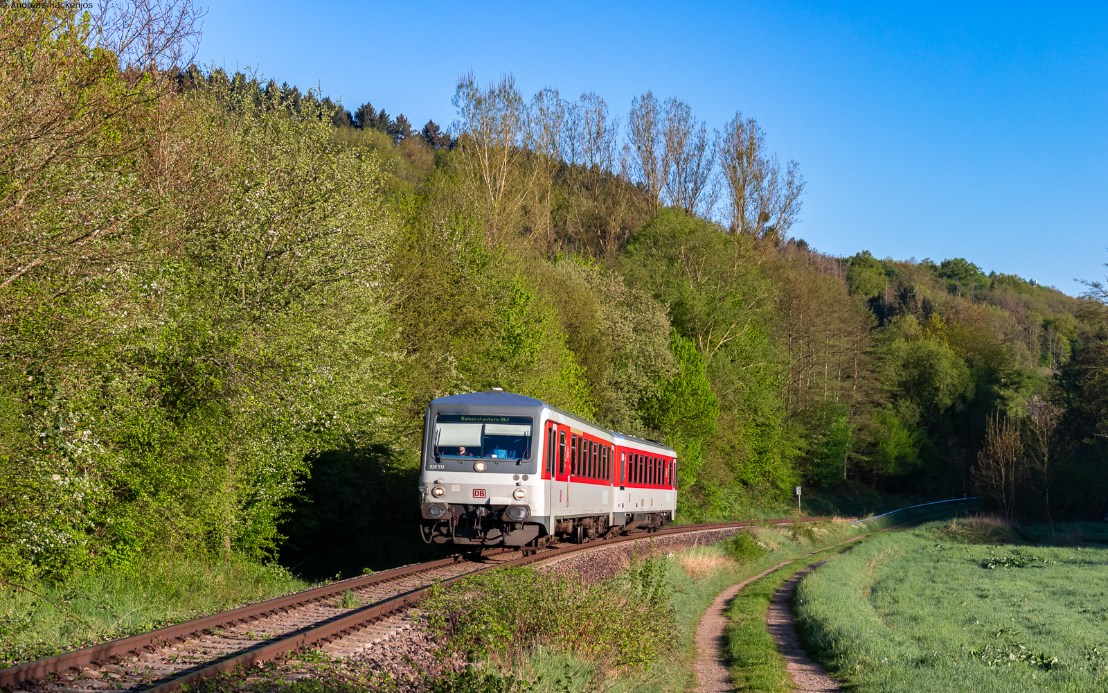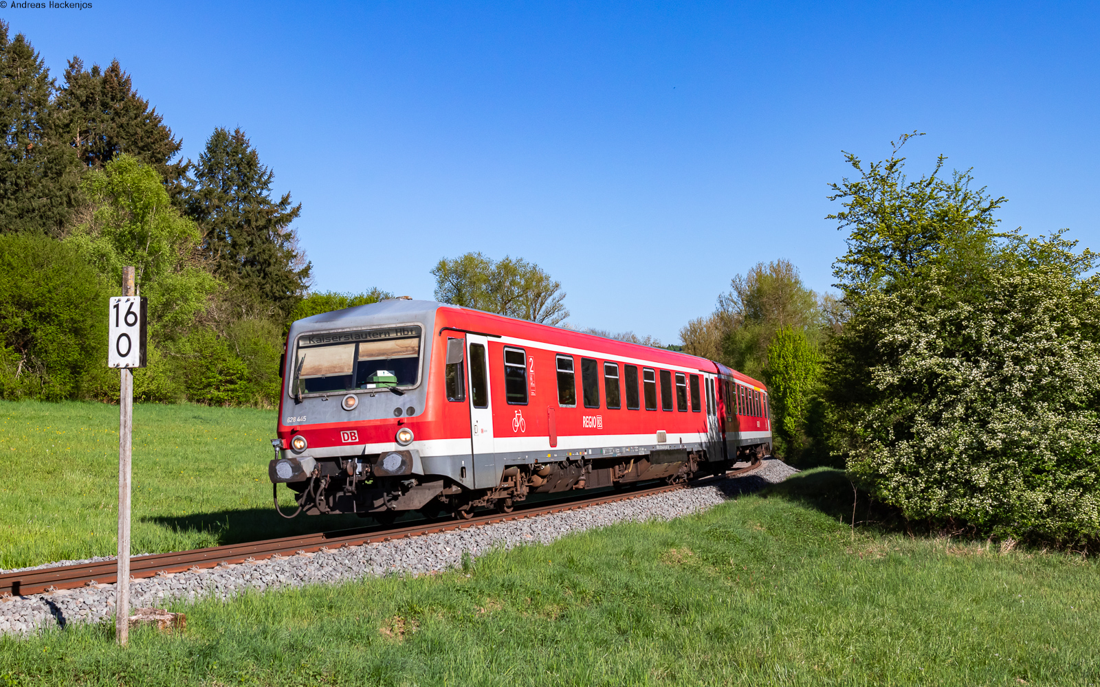 628 574 war am 8. April 2025 auf der "Chiemgaubahn" zwischen Prien am Chiemsee und Aschau im Chiemgau, hier bei Vachendorf, im Einsatz. Rolf Eisenkolb
