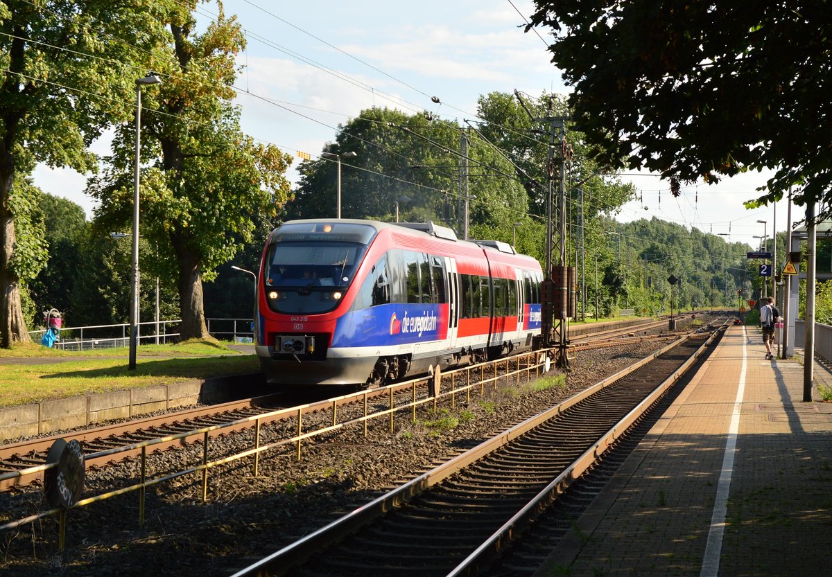 Eine RB 20 der Euregiobahn verlässt hier gerade Kohlscheid gen Herzogenrath, dem Endpunkt der Linie am Sonntag den 31.7.2016, bei dem Triebwagen handelt es sich um den 643 215. Andreas Strobel