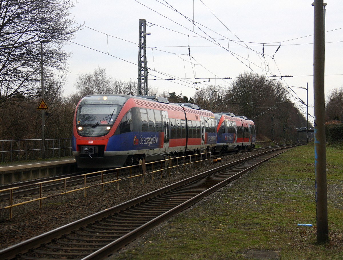 Zwei Euregiobahn (RB20) aus Eschweiler-Sankt-Jöris nach Düren und kommen die Kohlscheider-Rampe hoch aus Richtung Herzogenrath und halten in Kohlscheid und fahren in Richtung Richterich,Laurensberg,Aachen-West.