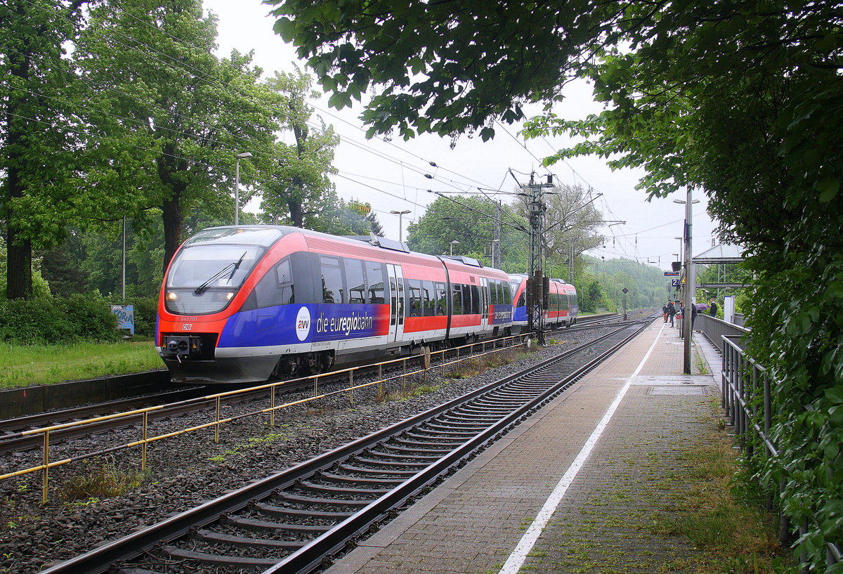 Zwei Euregiobahn (RB20) aus Eschweiler-Sankt-Jöris nach Düren-Stolberg-Altstadt und kommen die Kohlscheider-Rampe hoch aus Richtung Herzogenrath und halten in Kohlscheid und fahren in Richtung Richterich,Laurensberg,Aachen-West.