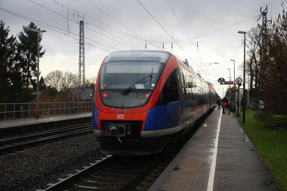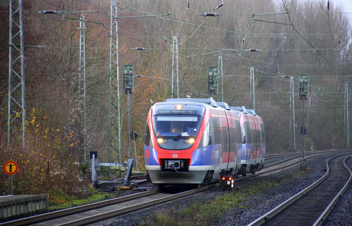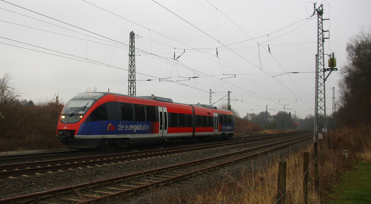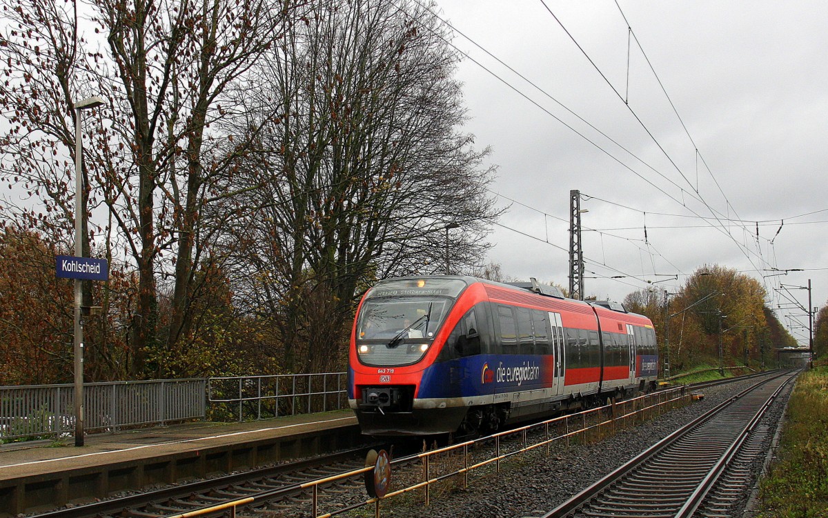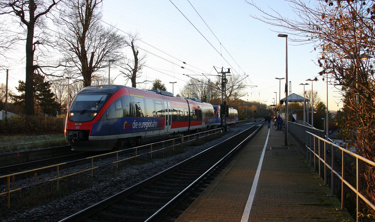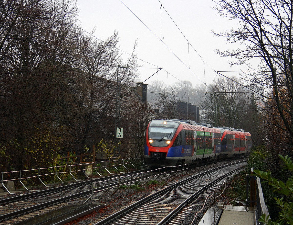 Die Euregiobahn (RB20) kommt aus Eschweiler-Sankt-Jöris nach Stolberg-Altstadt kommt die Kohlscheider-Rampe hoch aus Richtung Herzogenrath und hält in Kohlscheid und fährt in Richtung Richterich,Laurensberg,Aachen-West. Bei Nieselregen am Mittag vom 29.11.2015. Stefan Hochstetter