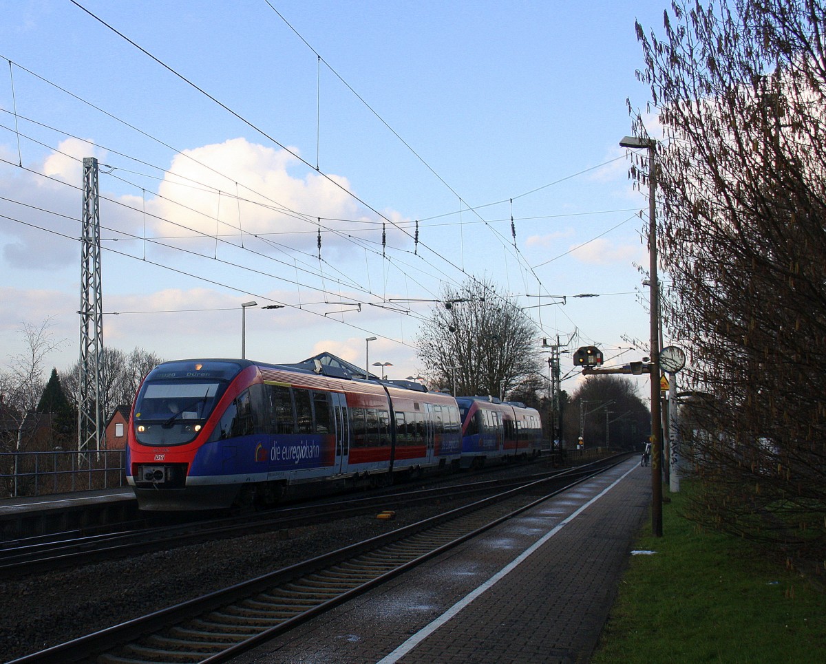 Zwei Euregiobahn (RB20) aus Eschweiler-Sankt-Jöris nach Düren nd kommen die Kohlscheider-Rampe hoch aus Richtung Herzogenrath und halten in Kohlscheid und fahren in Richtung Richterich,Laurensberg,Aachen-West.