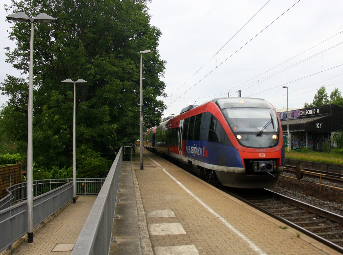 Zwei Euregiobahn (RB20) aus Heerlen(NL)-Stolberg-Altstadt-Düren kommt die Kohlscheider-Rampe hoch aus Richtung Herzogenrath und hält in Kohlscheid und fährt in Richtung Richterich,Laurensberg,Aachen-West. Bei schönem Sonnenschein am Morgen vom 16.7.2014. Stefan Hochstetter