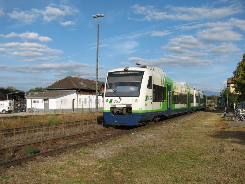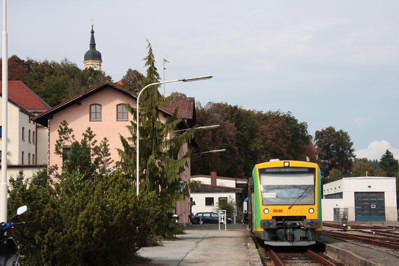 VT34 der Oberpfalzbahn bei Ausf. aus dem Bf Lam als RB92276 nach Bad Kötzting. Dahinter die, seit Inbetriebnahme des Werkes Schwandorf, ungenutzten Halle der regentalwerke. (25.09.2009) Rüdiger Ulrich
