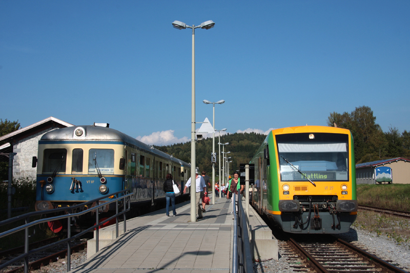 Kreuzung im Bf Roding mit den Oberpfalzbahntriebwagen VT32 als RB32227 (Schwandorf - Furth im Wald) und VT31 als RB32286 (Lam - Schwandorf) am 26.09.2009. Rüdiger Ulrich