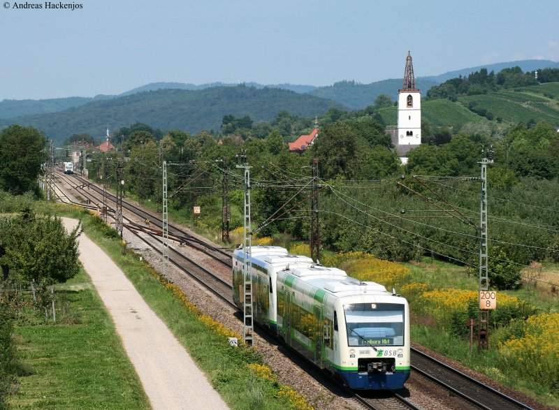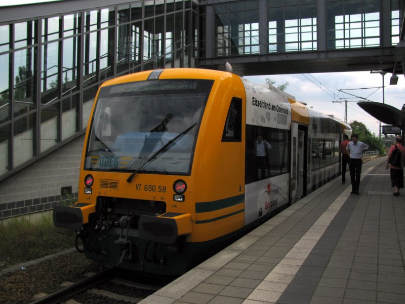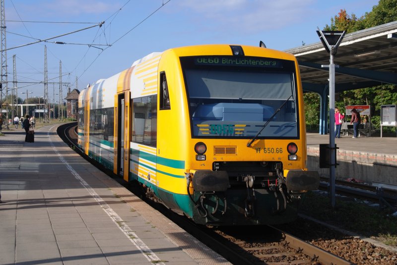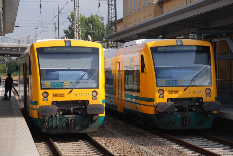 EBERSWALDE (Landkreis Barnim), 23.09.2009, VT 650.68 als 0E60 nach Frankfurt (Oder) und VT 650.75 als OE63 nach Joachimsthal im Bahnhof Reinhard Zabel