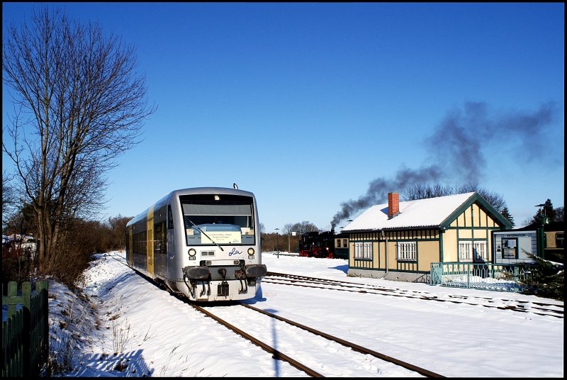 OLA VT 010 fährt als OLA80107 von Bergen nach Lauterbach Mole am 14.02.2009 in den Bahnhof Putbus ein. Im Hintergrund köchelt 99 1784-0 vor sich hin und wartet mit ihrem P 107 nach Göhren auf Anschlußfahrgäste. Jens-Peter Schlör