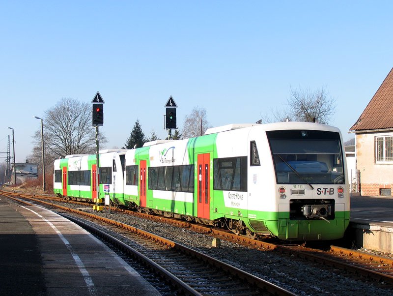 VT 110 und VT 111 (BR 650, RegioShuttle RS1) der Süd Thüringen Bahn bei Ausfahrt aus Sonneberg (Thür) als STB 82925 nach Eisenach; 20.12.2007