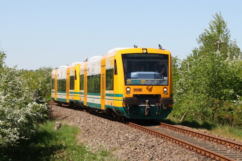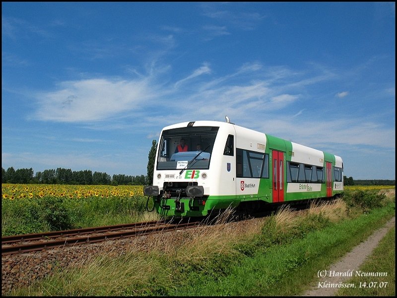 Am 14.07.07 fährt der TW001 der EIB durchs flache sonnenblumengeschmückte Brandenburger Land für die DRE auf der Strecke Hohenbucko-Lebusa - Falkenberg/Elster. Harald Neumann