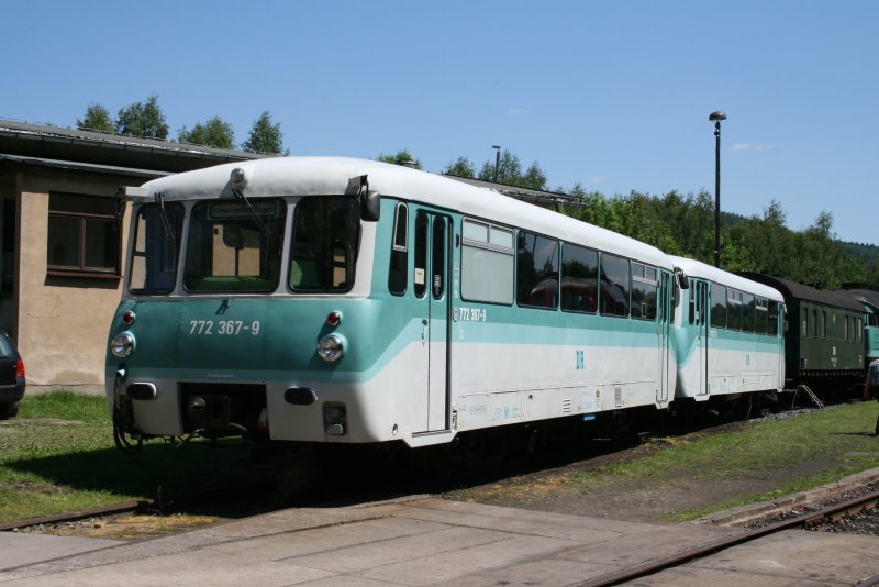 772 312-5 und 772 367-9 am 23.05.09 im Eisenbahnmuseum Schwarzenberg. Die beiden Adorfer Triebwagen werden für die Touristischen Fahrten der Erzgebirgischen Aussichtsbahn vom VSE genutzt. Daniel T.