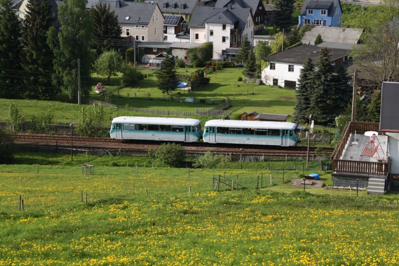 Der letzte Zug am ersten Fahrtenwochende der Erzgebirgischen Aussichtsbahn mit 772 367-9 und 772 312-5 ist am 10.05.09 bei Walthersdorf unterwegs. Daniel T.