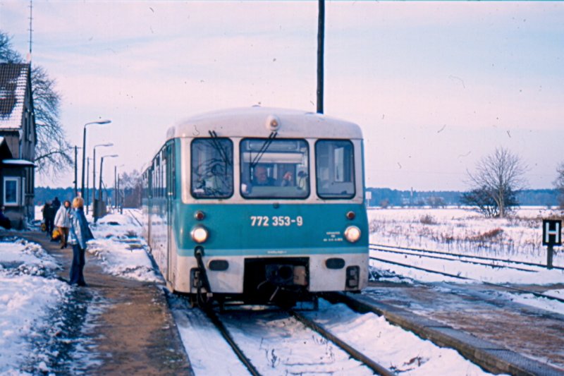 Im Jahr 2002 waren die Ferkeltaxen der BR 772 nördlich von Berlin noch relativ zahlreich vertreten. 772 353-9 steht hier im Bahnhof Löwenberg (Mark) und hat auf der Fahrt von Neuruppin seinen Endbahnhof erreicht. Hinweis: eingescanntes Dia Karsten Schmidt
