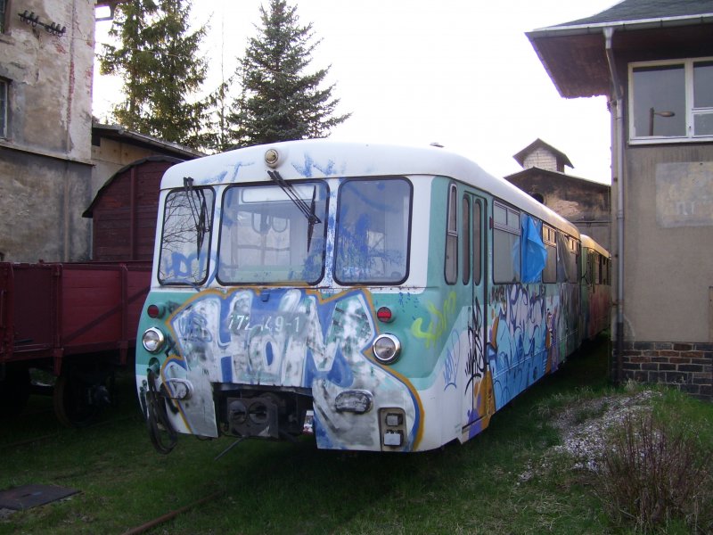 Der letzte Zug des ersten Fahrtag der Erzgebirgischen Aussichtsbahn fährt, bestehend aus 772 367-9 und 772 312-5 aus dem Bahnhof Scheibenberg aus. (09.05.09) Daniel T.