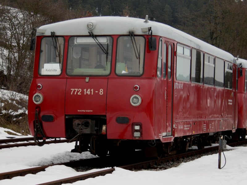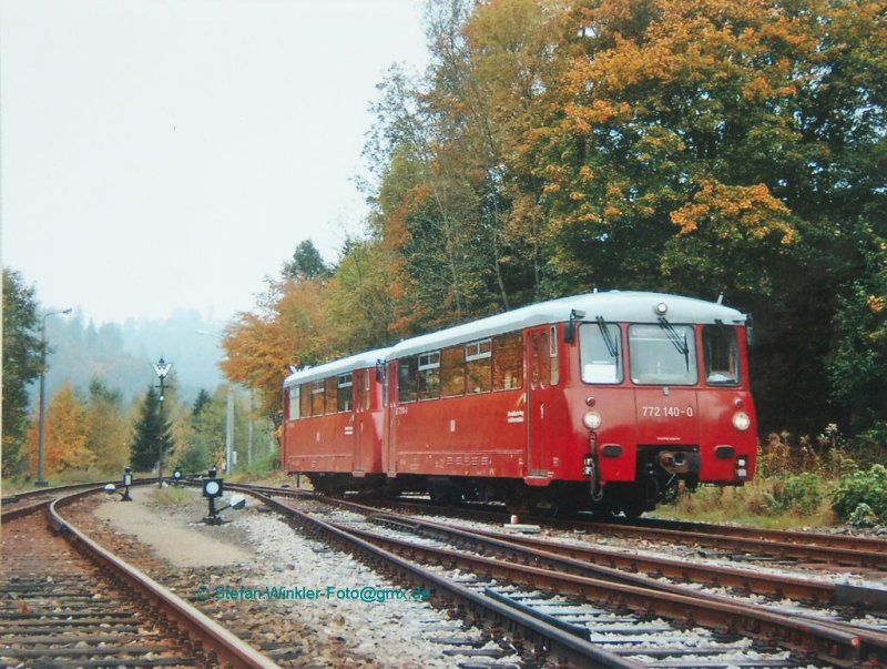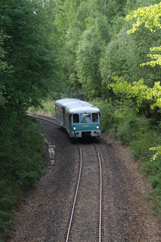Am ersten Fahrtag der Erzgebirgischen Aussichtsbahn fährt 772 312-5 mit 772 367-9 aus Richtung Schwarzenberg in den Bahnhof Scheibenberg ein. (09.05.09) Daniel T.