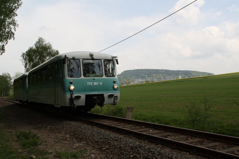 Am ersten Fahrtag der Erzgebirgischen Aussichtsbahn ist 772 367-9 mit 772 312-5 aus Richtung Annaberg-Buchholz kommend nahe Scheibenberg unterwegs. Im Hintergrund ist der Scheibenberg zu sehen. (09.05.09) Daniel T.