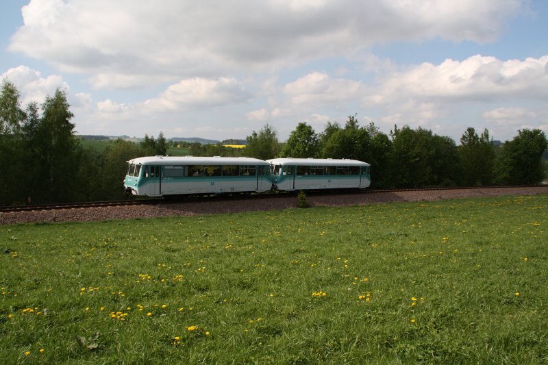 Am zweiten Fahrtag der Erzgebirgischen Aussichtsbahn sind 772 367-9 und 772 312-5 in Richtung Annaberg-Buchholz nahe Schlettau unterwegs. (10.05.09) Daniel T.