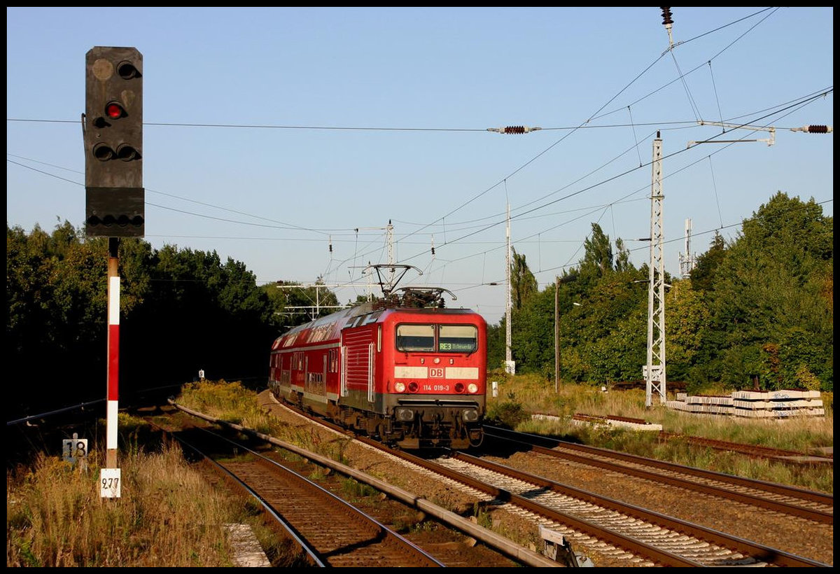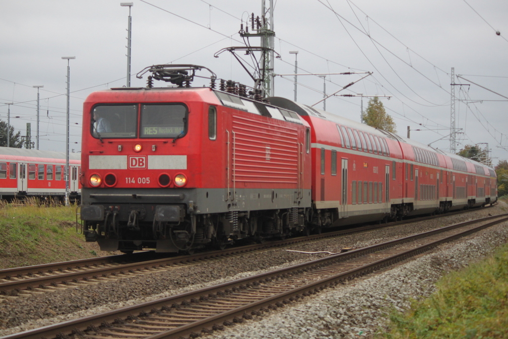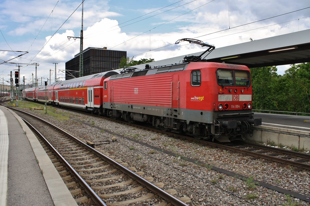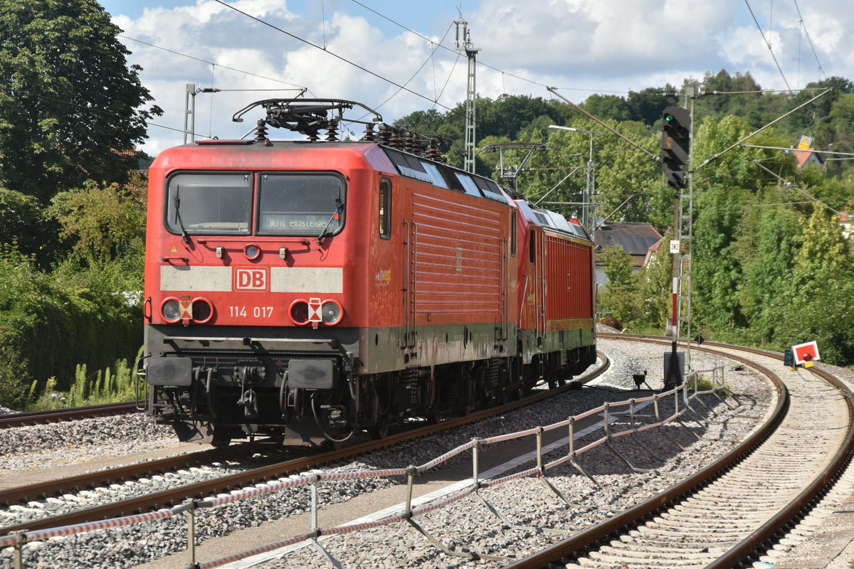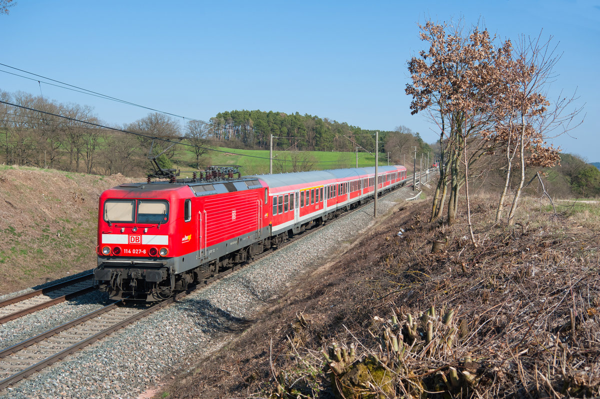 Bei leider eher dürftigem Wetter zieht 114 023 ihre n-Wagen Garnitur als RE Nürnberg - Stuttgart hinter dem Kappelsberg-Tunnel nahe Gaildorf um die Kurve. Aufgenommen am 17.4.2019 10:10 Br111 Fan