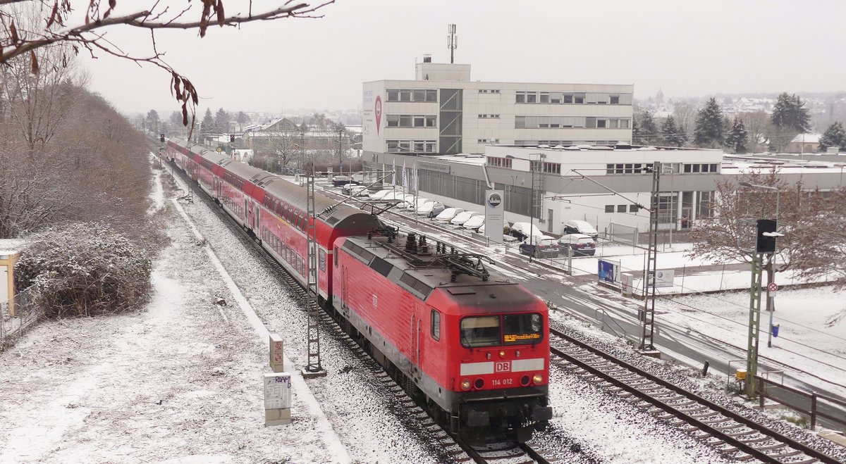 114 012 zieht einen RE50 gen Frankfurt Hbf und wurde hier beim Durchfahren des Ortsteils Mühlberg fotografiert. Aufgenommen am 16.12.2018 11:38 Br111 Fan