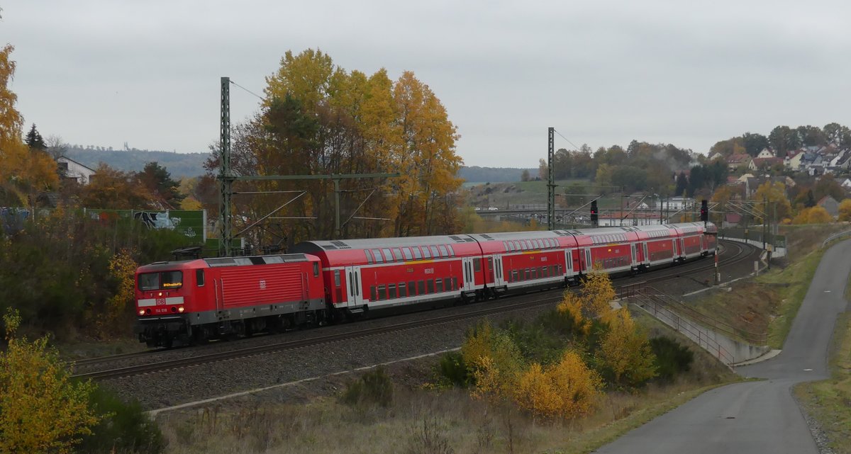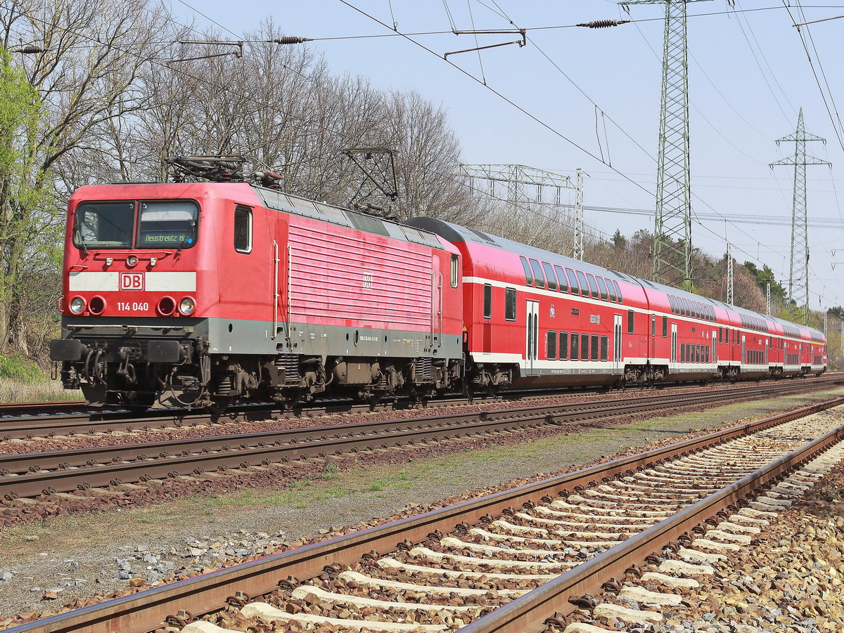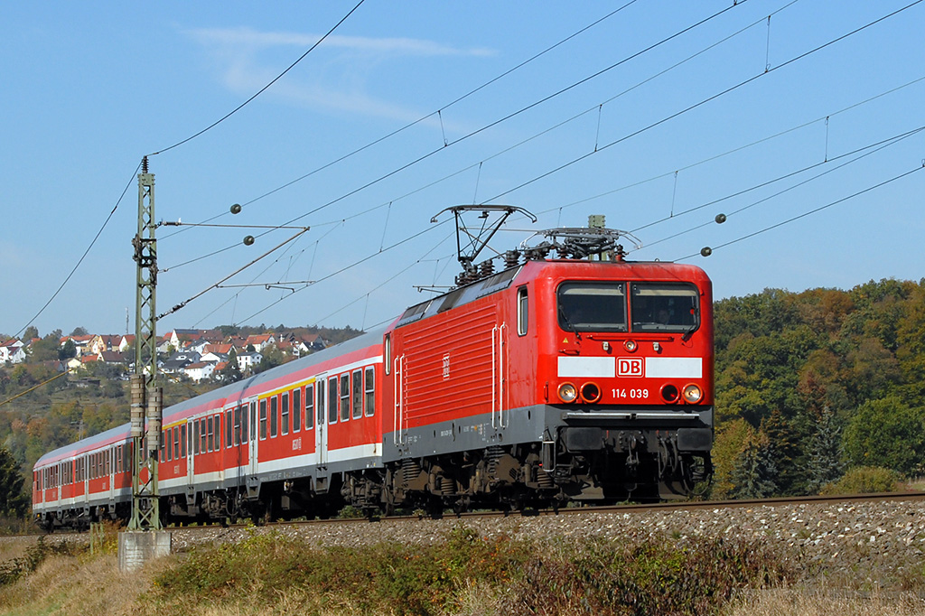 114 009 fährt einen Regionalexpress mit sechs Doppelstockwagen an Haitz-Höchst vorbei. Die Linie RE50 verbindet Fulda stündlich mit Frankfurt am Main, über die Kinzigtalbahn. Anton Eisenbach