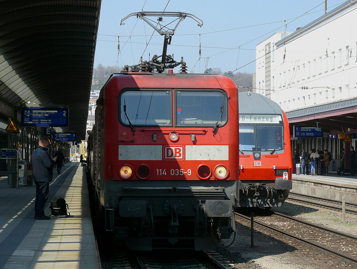 Am 15.04.2019 steht 114 035 vor der RB 19250 nach Stuttgart HBF. Hinter sich hat sie die 146 202, diese stellte sie kurz darauf im Ulmer Gleisfeld ab und fuhr mit der RB nach Stuttgart. Joni 103