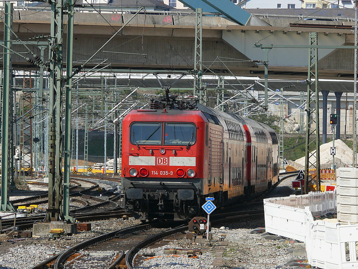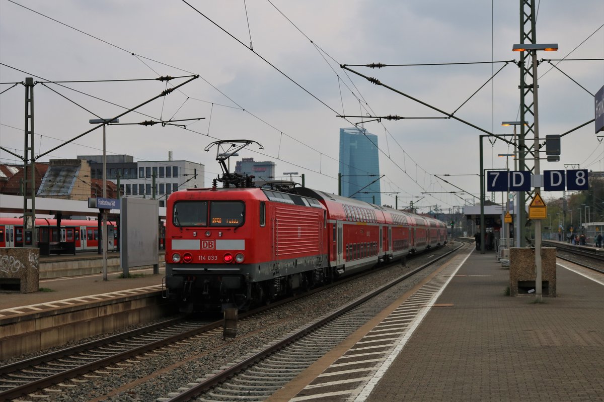Zusehen ist 114 035 wie sie am 15.04.2019 mit der RB 19250 den Ulmer Hauptbahnhofin Richtung Stutgart Hbf verlässt. Die RB hatte über 55 Min Verspätung und fuhr deshalb erst um 15:32 Uhr aus dem Ulmer Hbf. Joni 103