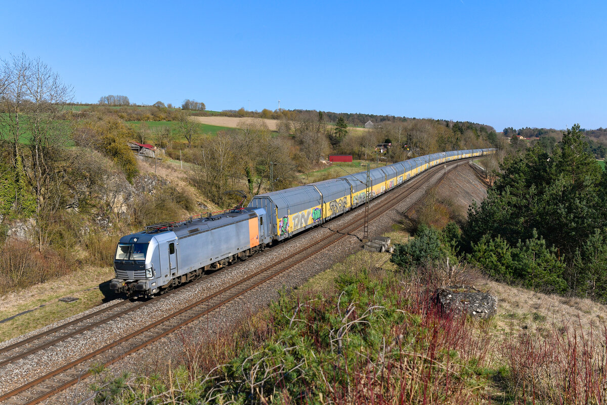 Auch wenn es im Fahrzeugbestand von TXL in jüngerer Vergangenheit auch die Auslieferung der firmeneigenen Vectrons einiges an Bewegung gab. die beiden von northrail angemieteten Loks sind nach wie vor für das Troisdorfer Unternehmen im Einsatz. Am 03. April 2025 bespannte die 193 921 den Autotransportzug DGS 59904 von Regensburg Ost nach Imsumer Deich und konnte von mir bei Laaber in der Oberpfalz fotografiert werden.