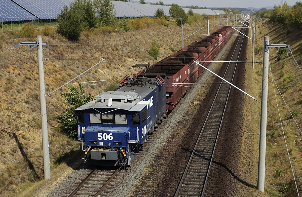 1999/2000 lieferte Adtranz zehn Lokomotiven des Typs EL 2000 an Rheinbraun (jetzt RWE Power AG), die mit 2.800 kW leistungsstärker als die EL 1 (1.760 kW) und mit 60 km/h schneller (EL 1 50 km/h) sind. Mit einem Leerzug durchfährt Lok 506 am 02.09.2020 Kerpen-Buir. Horst Lüdicke