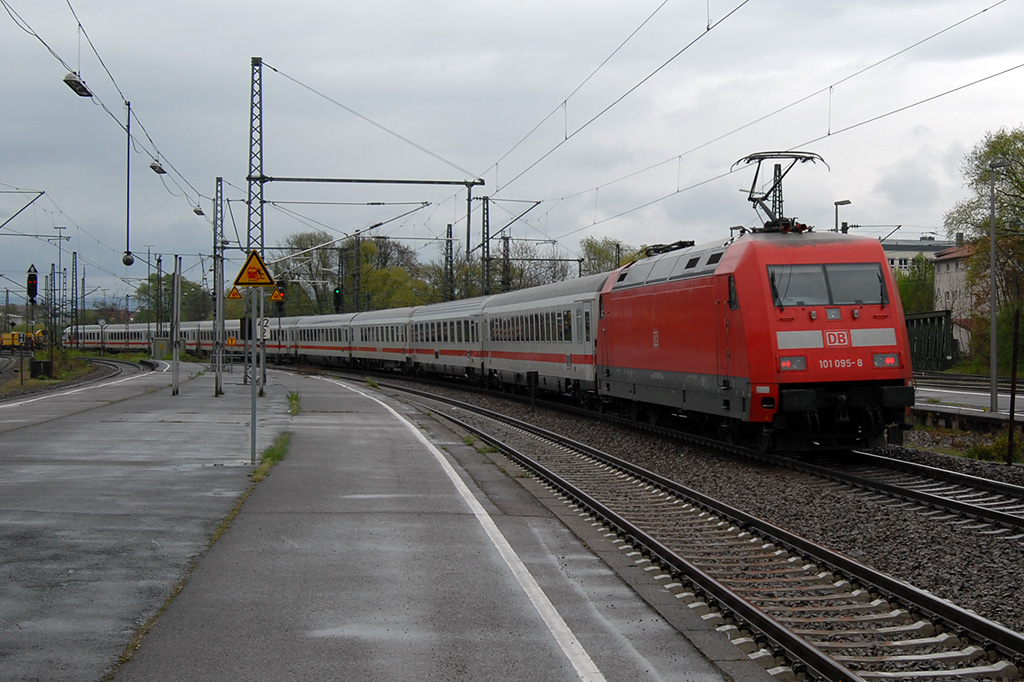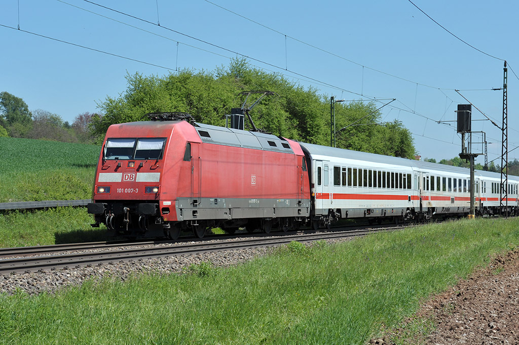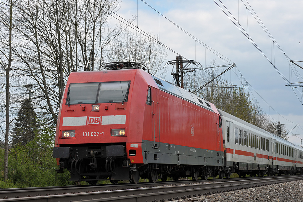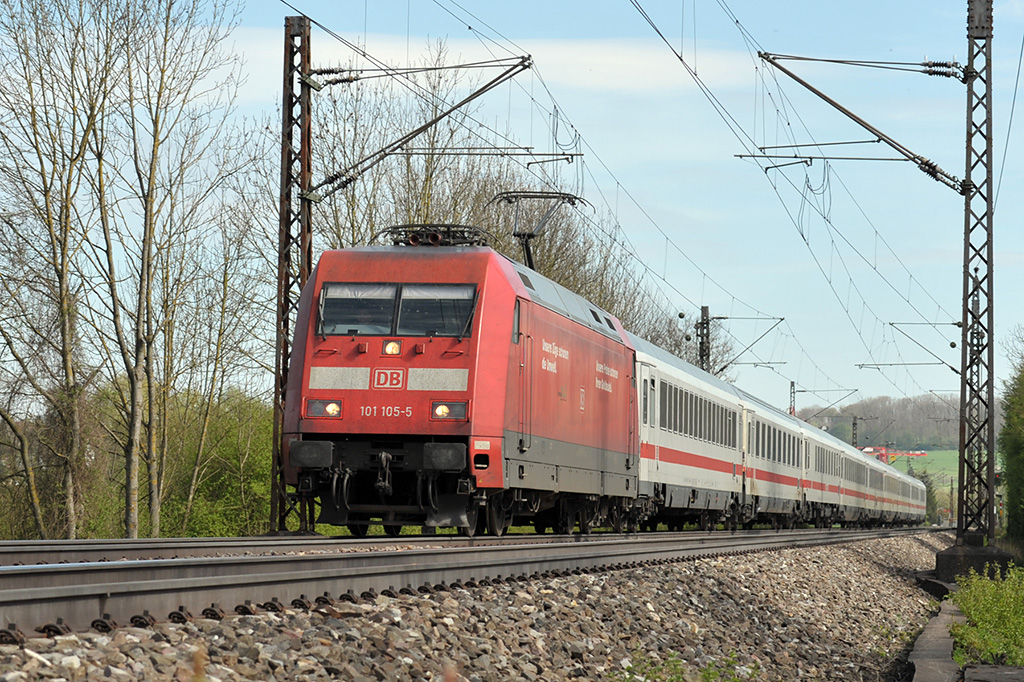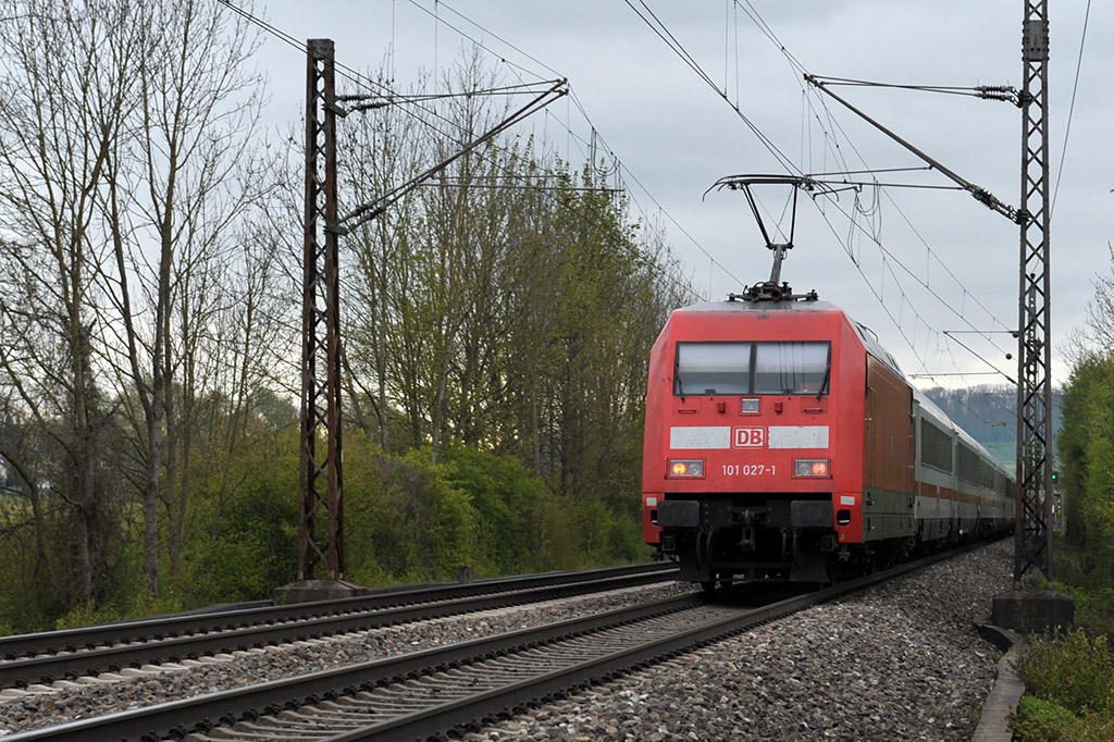 101 008-1 mit einem Eurocity Richtung Dresden-Prag in der Oberauer Kurve.09.04.2017 10:40 Uhr.