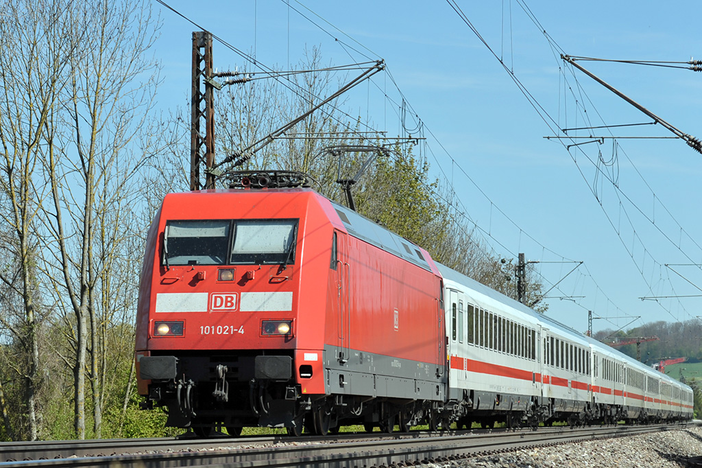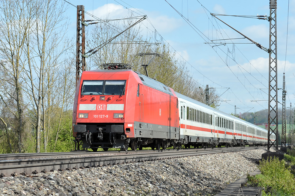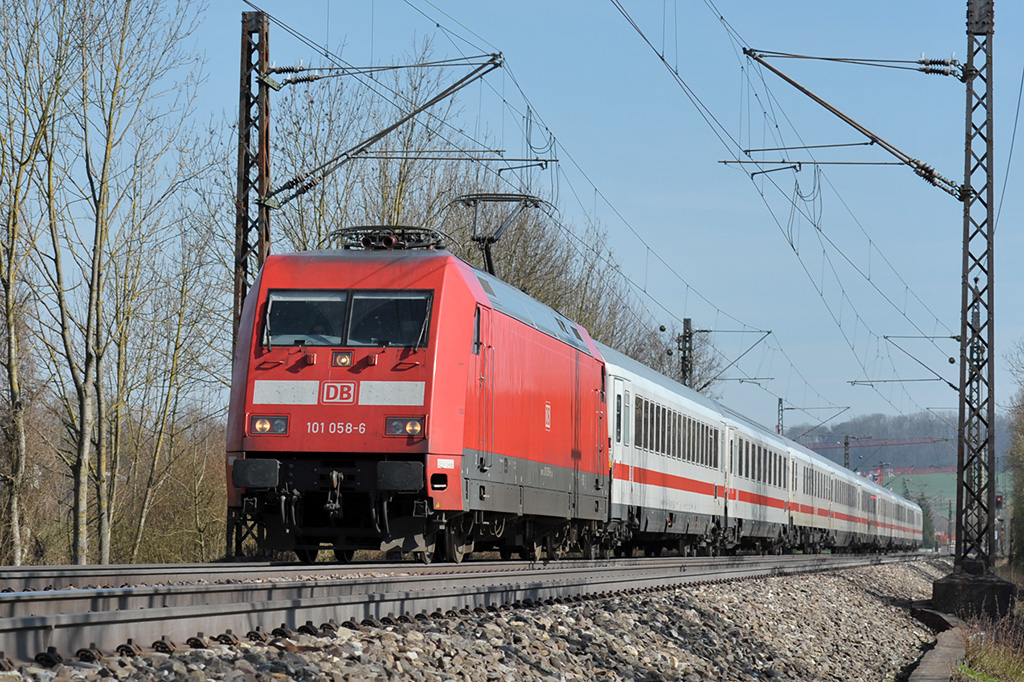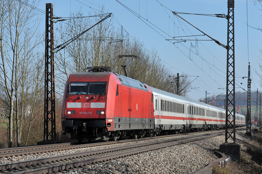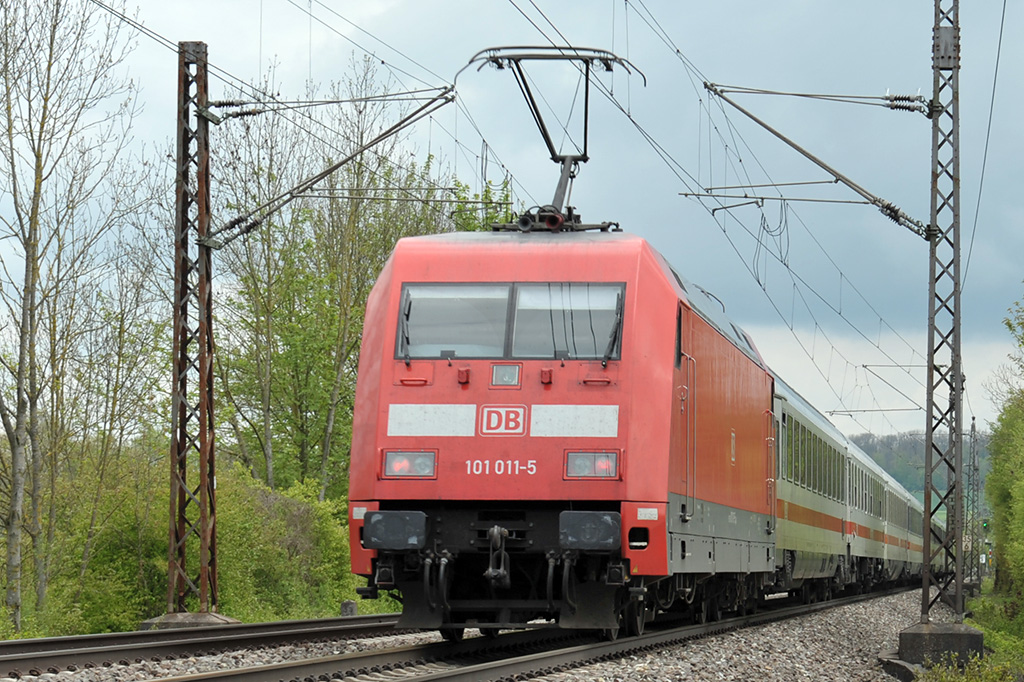 101 008-1 mit einem Eurocity Richtung Dresden-Prag in der Oberauer Kurve.09.04.2017 10:40 Uhr.