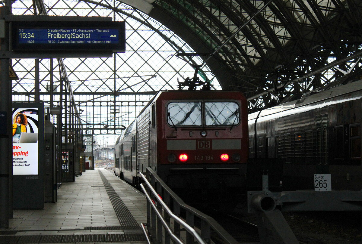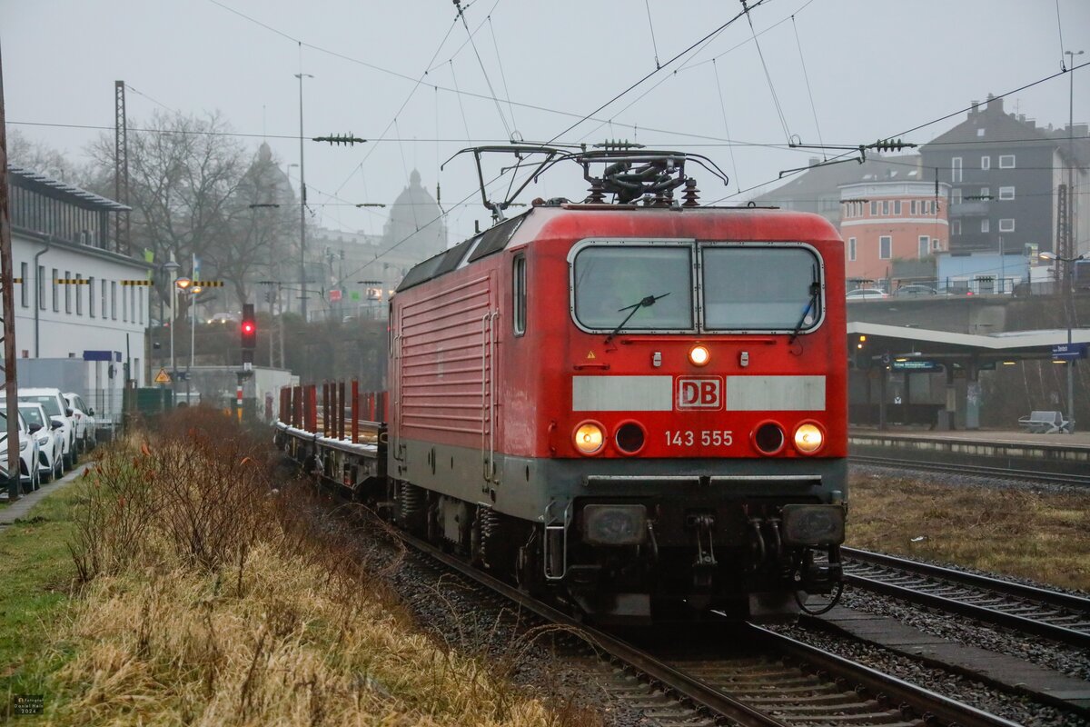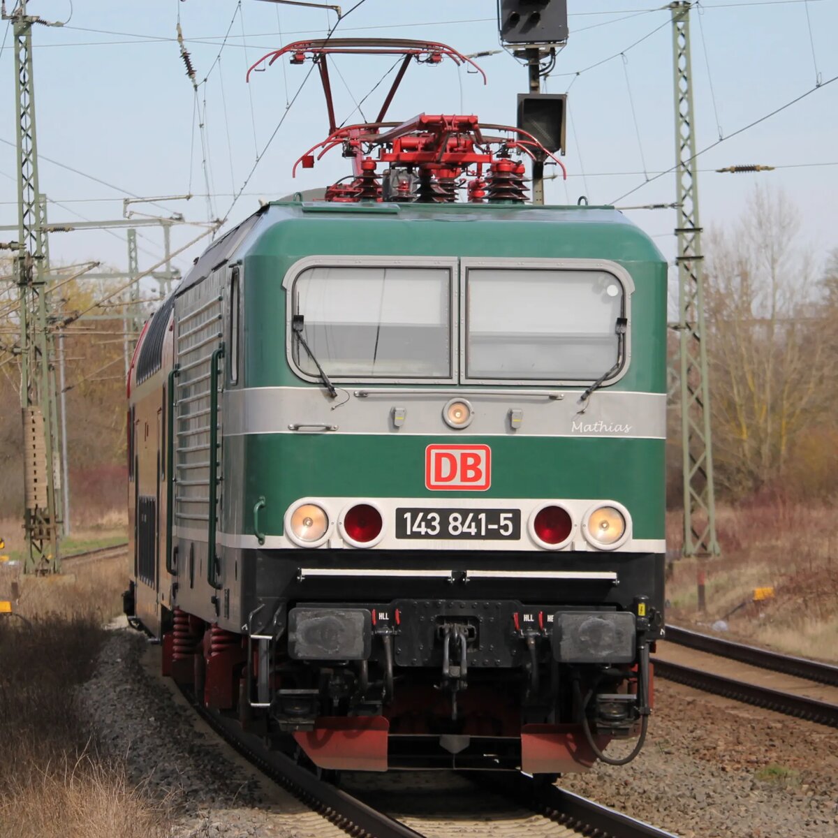 Am 18.3.24 fuhr DB Gebrauchtzug 143 841 "Mathias" mit zwei Saale-Express Dostos durch Naumburg (Saale) Hbf.