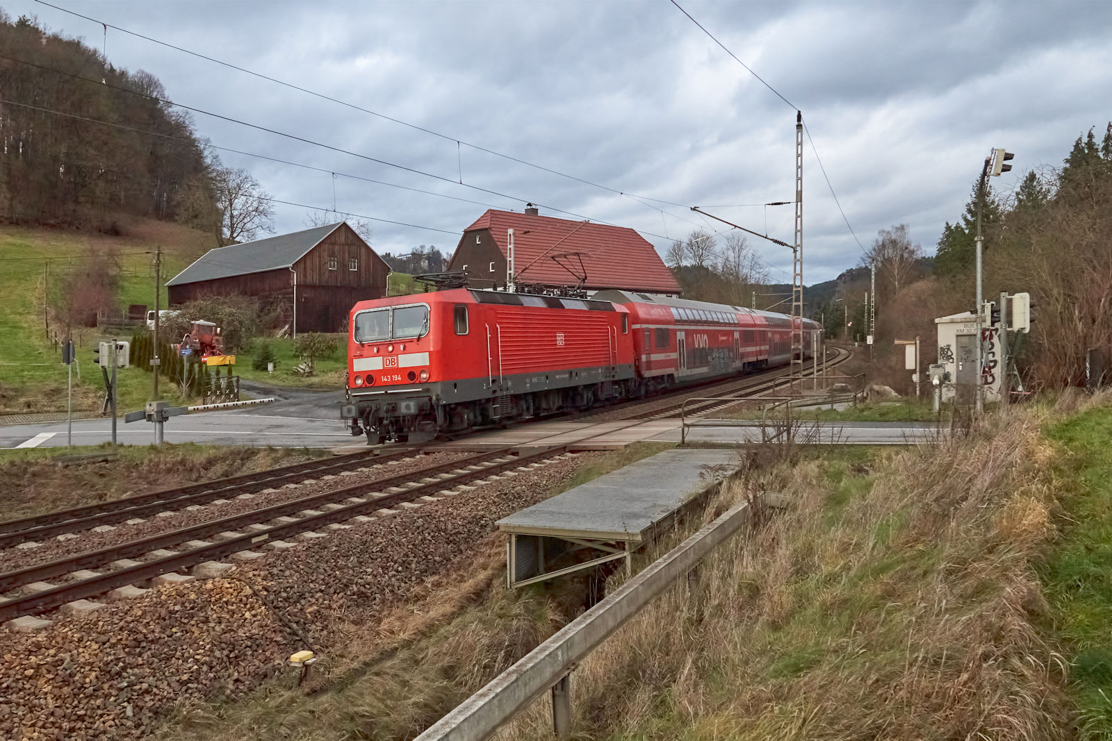 Auch im Dresdner S-Bahn-Verkehr ist die Baureihe 143 auf dem Rückzug. Am 03.01.2024 war mit 143 194 nur noch eine Maschine auf der S1 verplant. Sie zog S 31729 bei Strand durch das Elbtal in Richtung Bad Schandau.