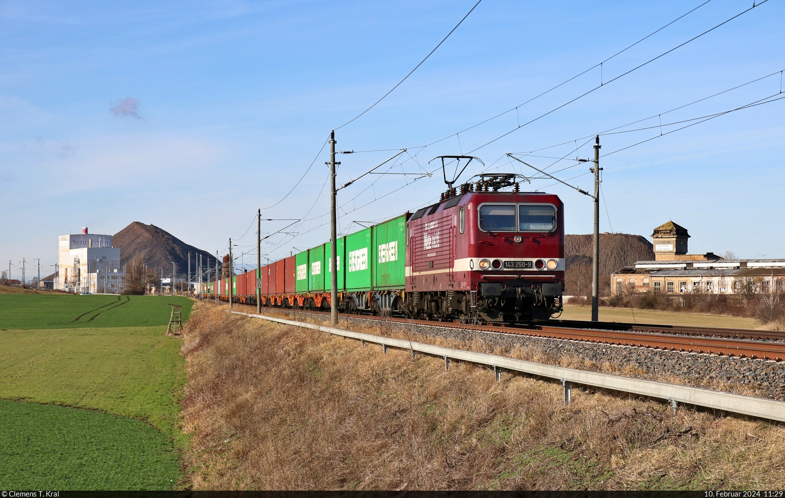 Ein etwas anderer "RE50" nach "Leipzig Hbf", wie auf der Zugzielanzeige von 143 250-9 steht. Die bordeauxrot lackierte Mietlok befördert Container östlich von Teutschenthal Richtung Halle (Saale). Leider keine regelmäßige Leistung hier, sondern ein Umleiter wegen Bauarbeiten zwischen Braunschweig und Magdeburg. 🧰 DB Gebrauchtzug (DB Regio Südost), vermietet an die Netzwerkbahn Sachsen GmbH (NeS) 🕓 10.2.2024 | 11:29 Uhr