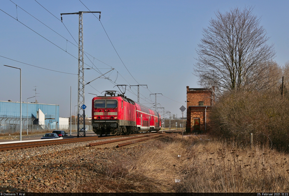 Nachschuss auf 143 168-3 am Bahnübergang (Bü) Zöberitzer Weg in Halle (Saale).