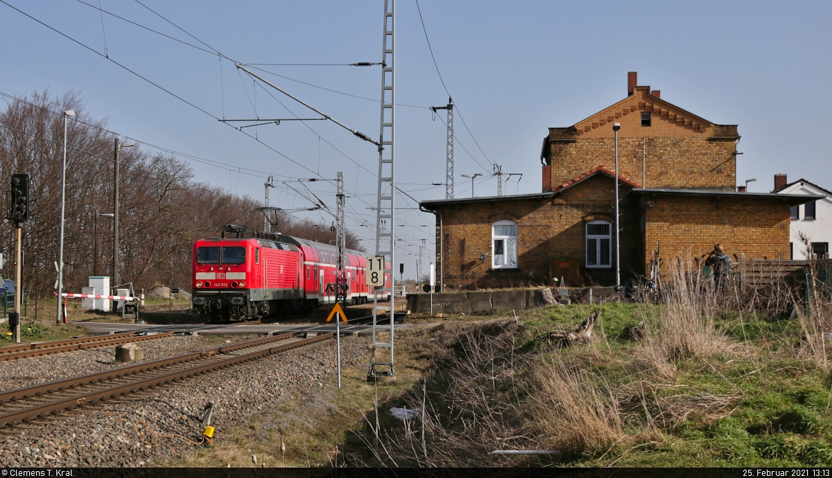 143 932-2 steht im Bahnhof Reußen neben dem Empfangsgebäude, in dem sich auch das elektromechanische Fahrdienstleiter-Stellwerk "R" der Bauform E 12/78 befindet.
