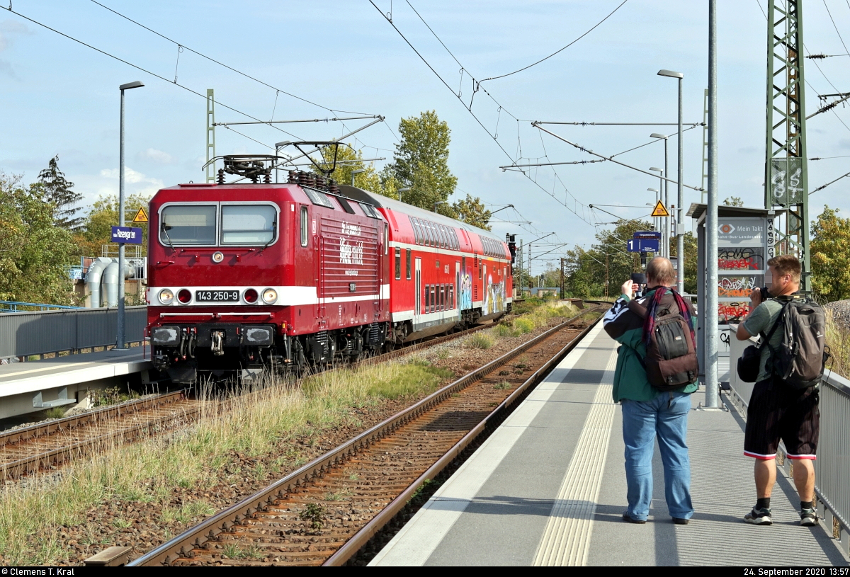 Ende September zog es viele Fotografen aus nah und fern auf die sonst so unpopuläre S7 in Halle (Saale), denn 143 250-9 wurde wegen des Schadens einer anderen Lok kurzfristig eingesetzt. Mit ihrem Retro-Look und der Aufschrift "Ihr Zug, unsere Lok: Miete mich!" macht sie nicht nur Bahnfreunde, sondern auch auf das DB Gebrauchtzugportal in besonderer Weise aufmerksam.