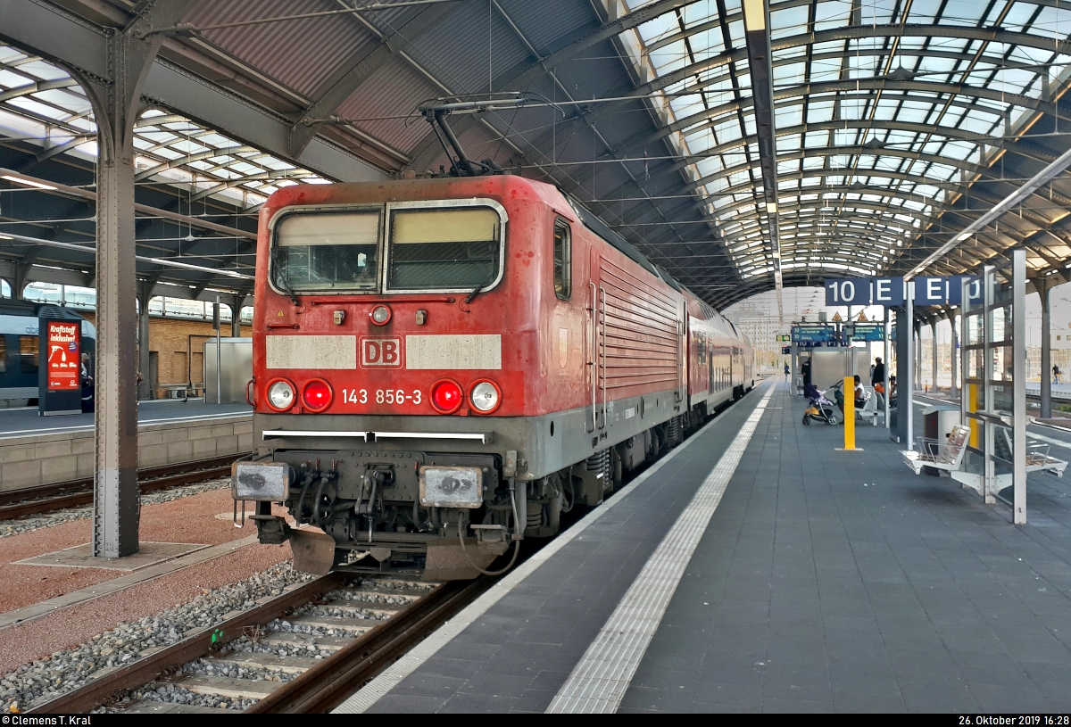 143 856-3 "Hinterzarten" der S-Bahn Mitteldeutschland (DB Regio Südost), ehem. DB Regio Baden-Württemberg, als S 37923 (S9) nach Eilenburg, einmal wieder ersatzweise für die BR 1442 (Bombardier Talent 2), steht im Startbahnhof Halle(Saale)Hbf auf Gleis 10 E-G.