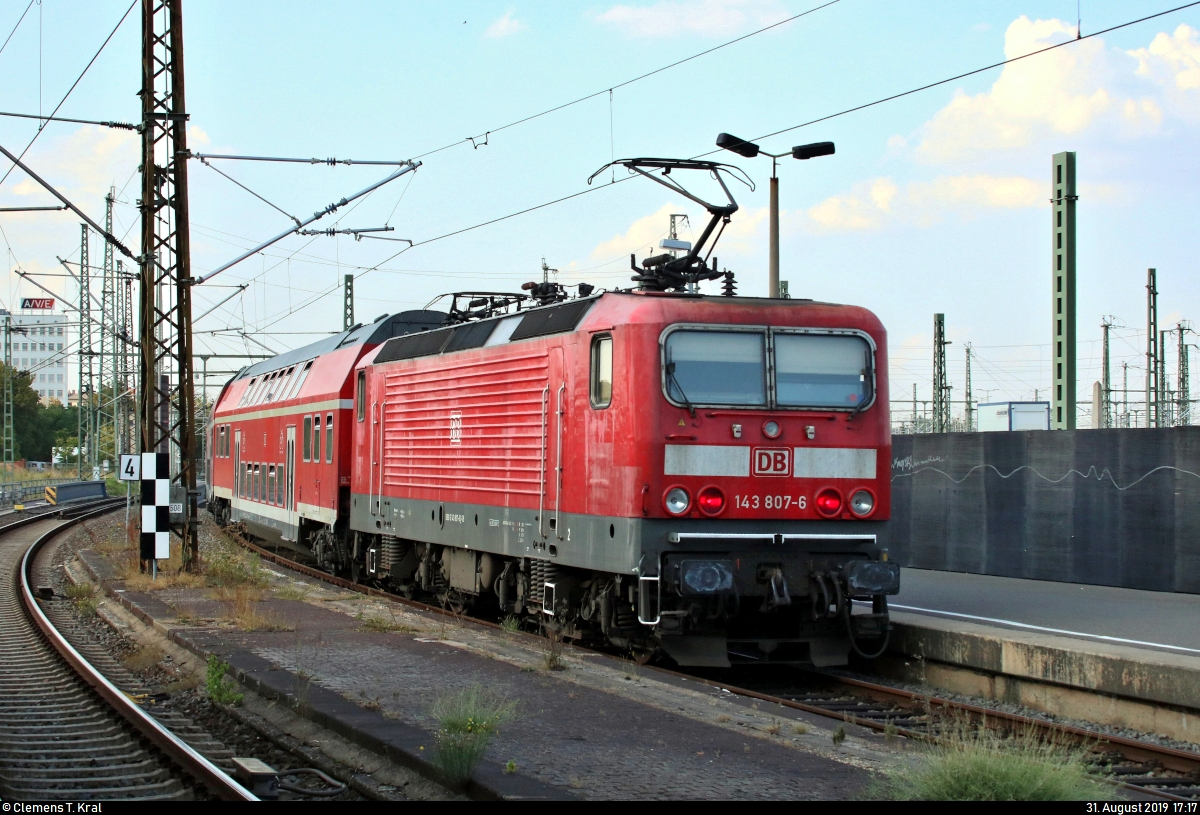 Nachschuss auf 143 807-6 von DB Regio Südost als S3 nach Halle-Trotha, die den Startbahnhof Halle(Saale)Hbf auf Gleis 1 verlässt.