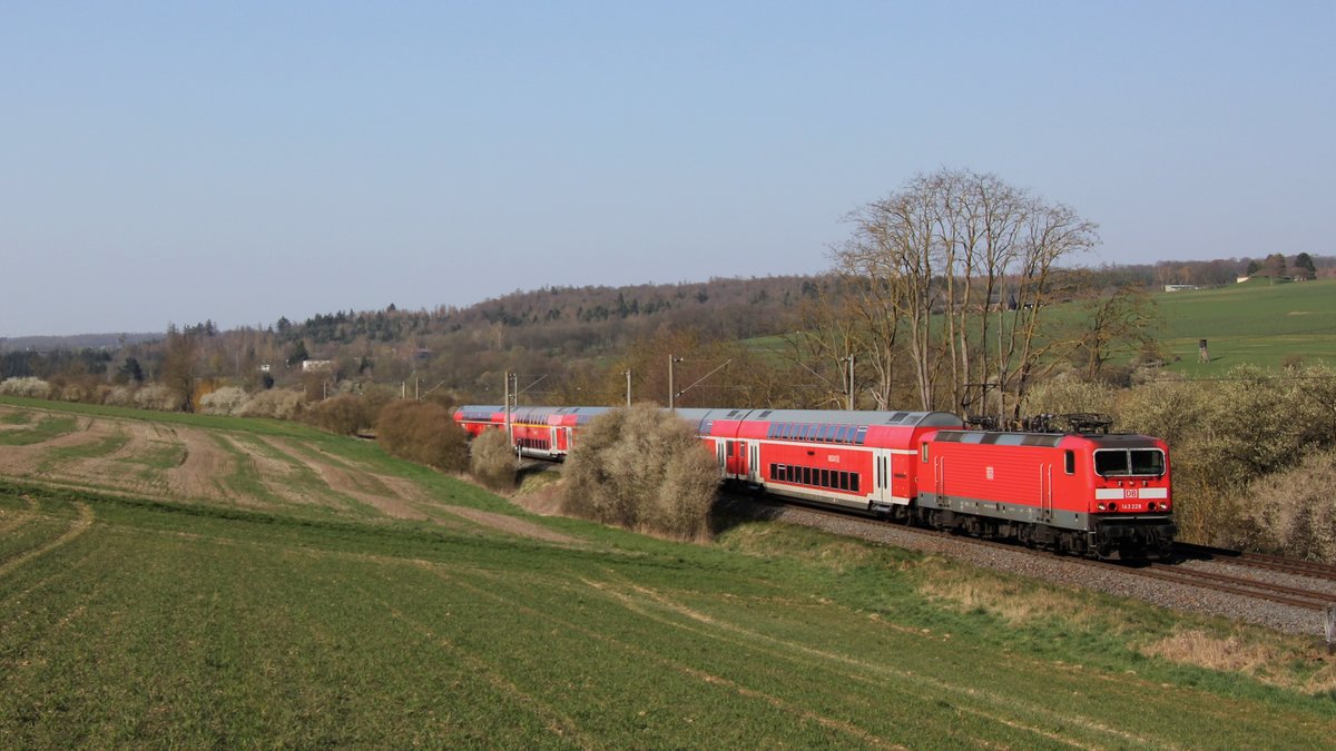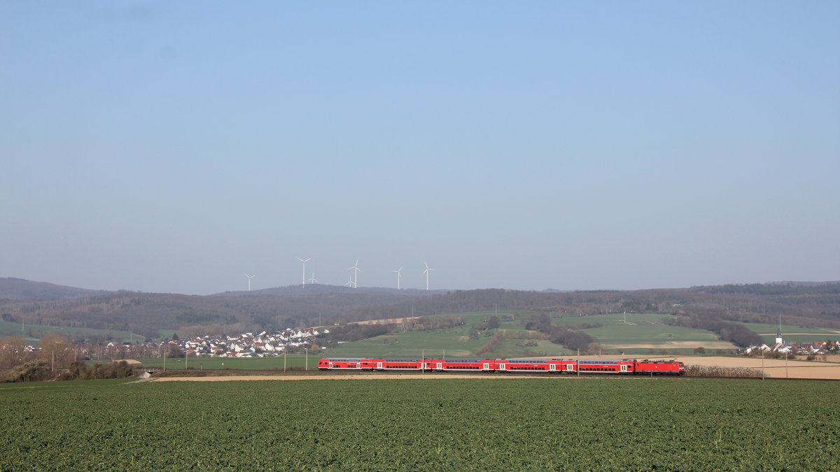 Die RB 15271 fährt am 27.03.2020 gezogen von 143 228 aus nicht-modernisierten und modernisierten Doppelstockwagen aus dem planmäßigen Wagenpark des Netzes, sowie einem gemischtklassigen Doppelstockwagen, der zuvor auf der Rhein-Main-Bahn unterwegs war von Limburg nach Frankfurt, hier zwischen Oberselters und Bad Camberg. Anton Eisenbach