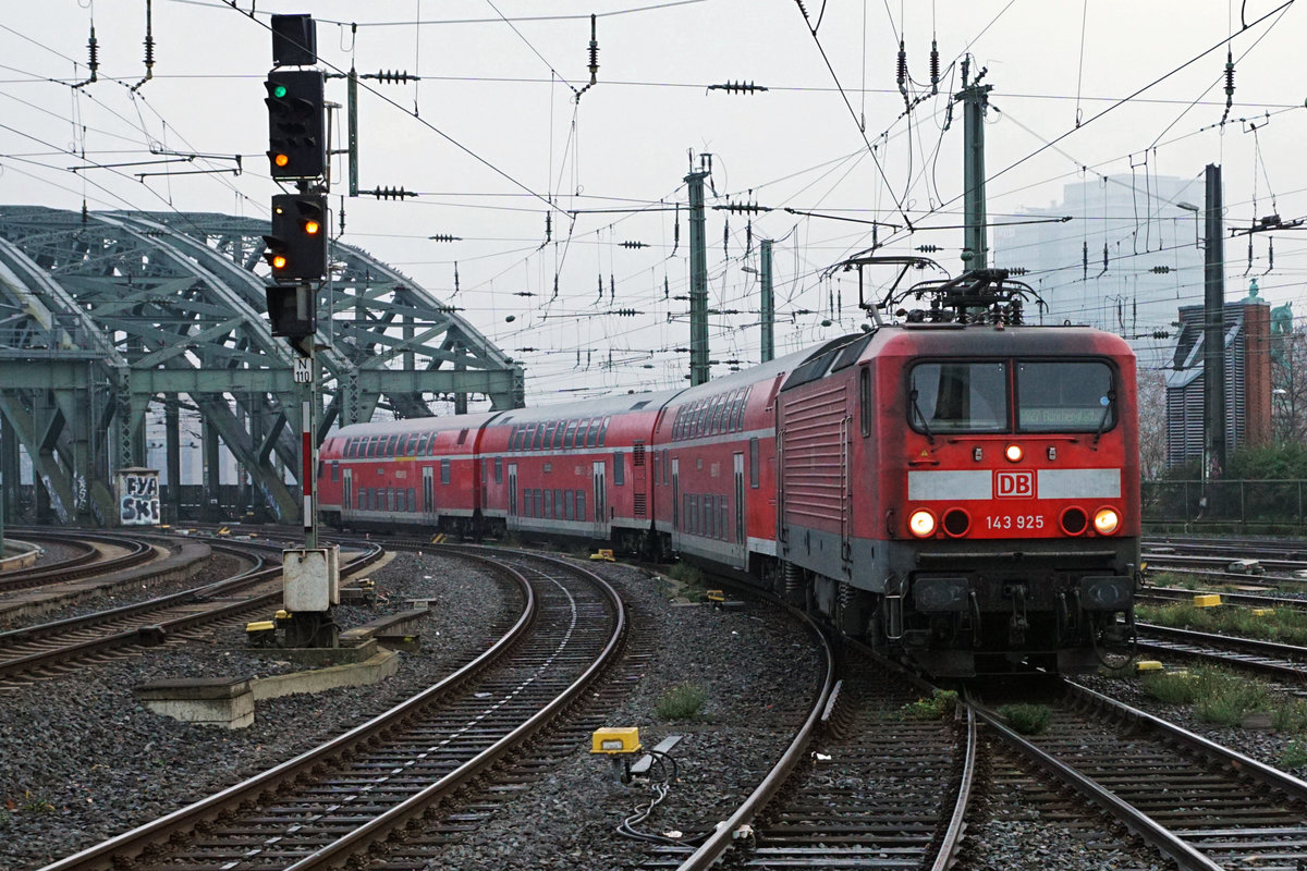 Am 2. Dezember 2019 konnte bei der Einfahrt in den Hauptbahnhof Köln einer der noch wenigen Dienste des RB 27 mit der 143 925 verewigt werden.
