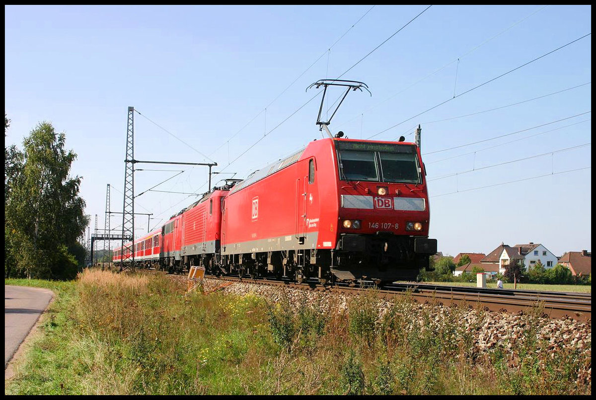 Gleich drei Lokomotiven vor einem Regionalzug sieht man auch nicht alle Tage. Am 12.09.2006 kam diese Zusammenstellung mir bei Dedensen auf der Fahrt in Richtung Hannover vor die Linse. Die drei Lokomotiven waren 146107, 143163 und 111143, also alles Loks, die damals ansonsten einzeln vor Regionalzügen zu beobachten waren. Gerd Hahn
