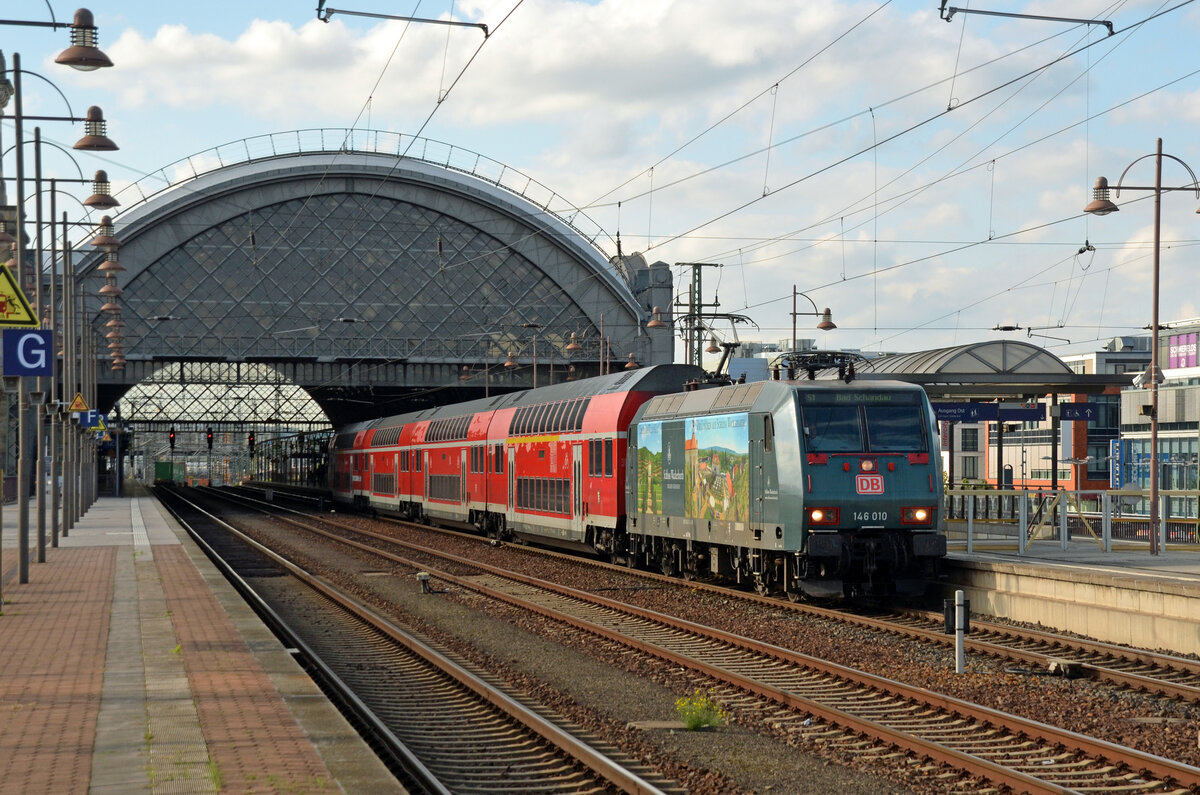 Die für das Erlebnisweingut Schloss Wackerbarth werbende 146 010-4 verlässt ihren vorletzten Unterwegsbahnhof Dresden-Neustadt auf Gleis 7.