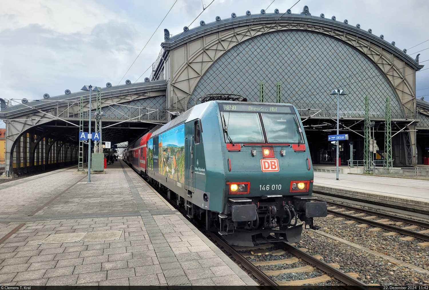 Die für das Erlebnisweingut Schloss Wackerbarth werbende 146 010-4 verlässt ihren vorletzten Unterwegsbahnhof Dresden-Neustadt auf Gleis 7. 🧰 DB Regio Südost 🚝 RE 16513 (RE 50) "Saxonia-Express" Leipzig Hbf–Dresden Hbf [+5] 🕓 22.12.2024 | 11:42 Uhr