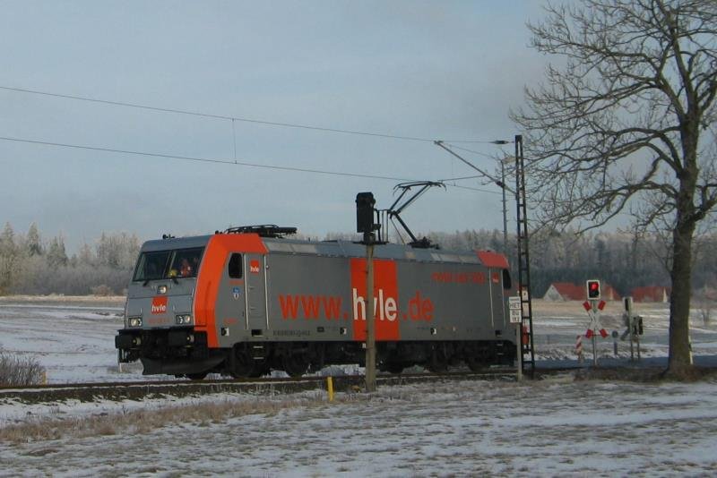 Zur Wiederaufnahme des elektrischen Zugbetriebs auf der Rübelandbahn fanden am 15./16.01.2009 Testfahten der sanierten Oberleitung statt. Dazu setzt die HVLE die E 185.01 / 185 583 ein. Hier erreicht die Maschine das Kalkwerk Hornberg; 16.01.2009 André Breutel