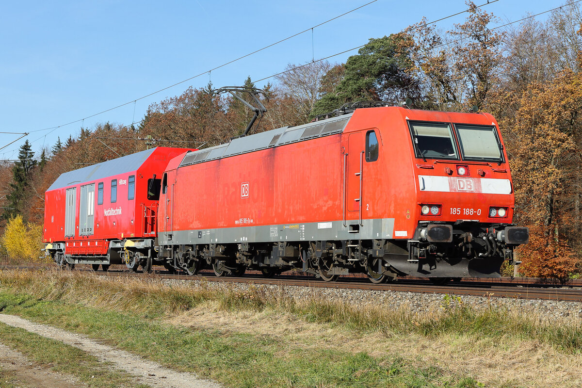 185 188 war mit einem Hilfswagen unterwegs Richtung Bad Reichenhall. Dort war eine Achse einer Ludmilla aus den Schienen gesprungen. Alle hatten auf eine spektakulärere Lok gehofft. Trotzdem lustiges Foto am 5.11.2025.