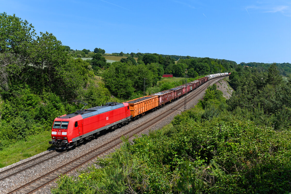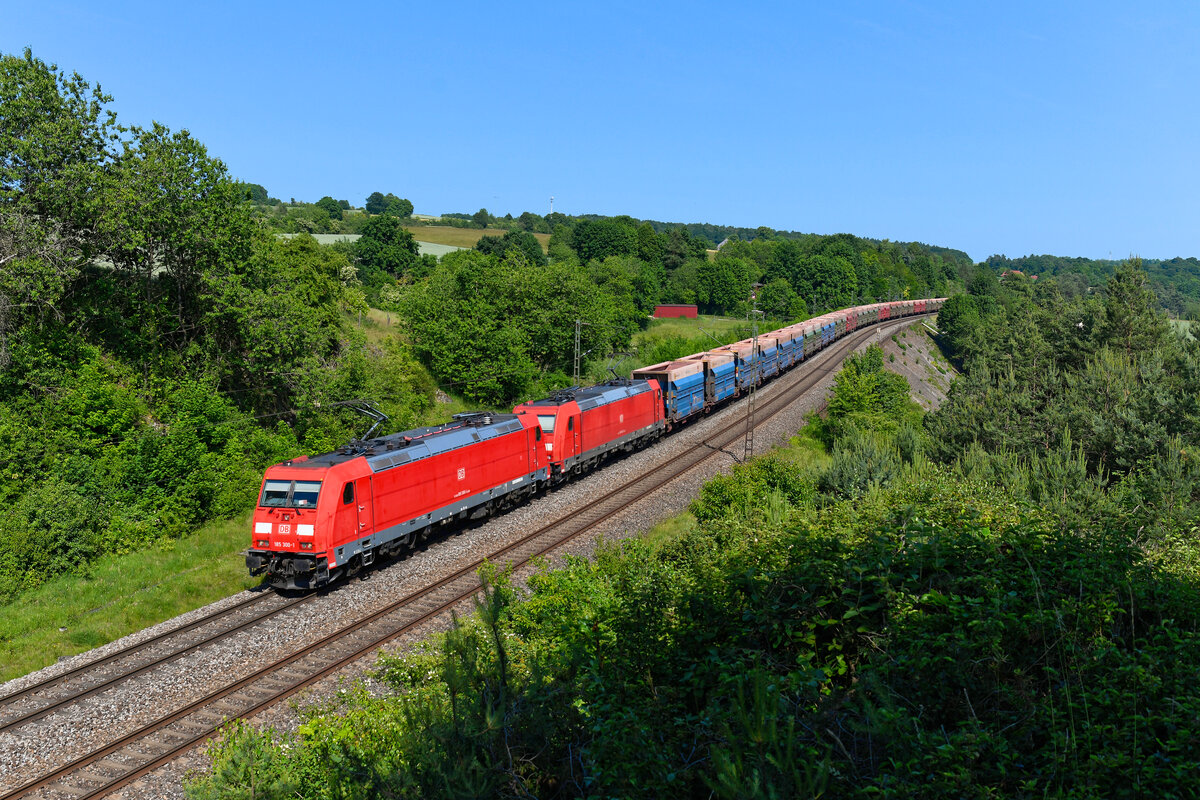 Am 13. Juni 2025 kamen die 185 300 und 253 von DB Cargo vor dem leeren Erzzug GAG 47920 von Linz Stahlwerke nach Hamburg-Waltershof Hansaport zum Einsatz. An der bekannten Fotostelle an der Stützmauer bei Laaaber in der Oberpfalz konnte ich den Zug praktisch in seiner gesamten Länge aufnehmen.