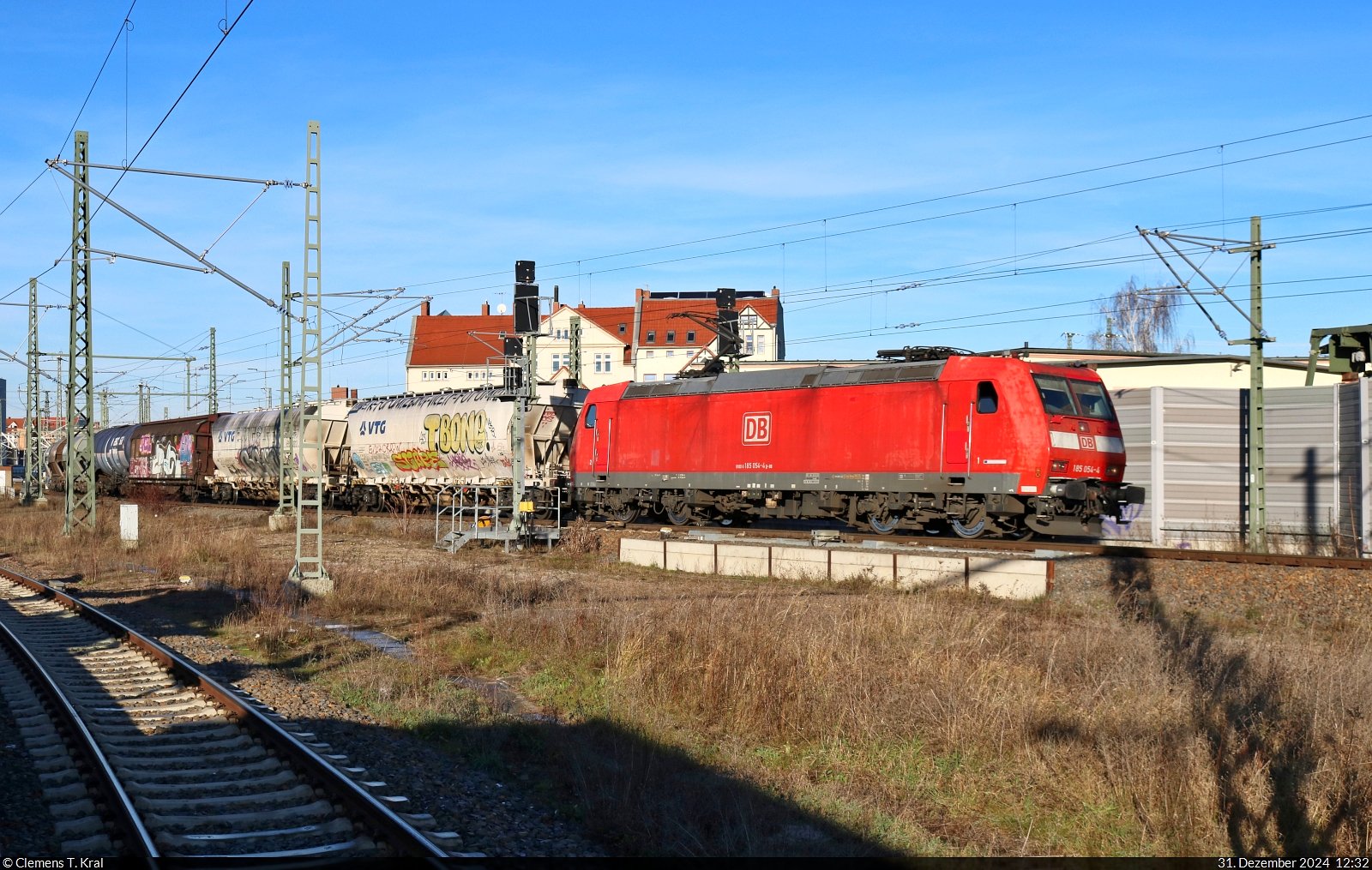185 054-4 zieht einen Gemischtwarenladen aus der Zugbildungsanlage (ZBA) Halle (Saale) und fährt damit am Halle(Saale)Hbf in südlicher Richtung vorbei. Aufnahme vom Bahnsteig 12/13. 🧰 DB Cargo 🕓 31.12.2024 | 12:32 Uhr