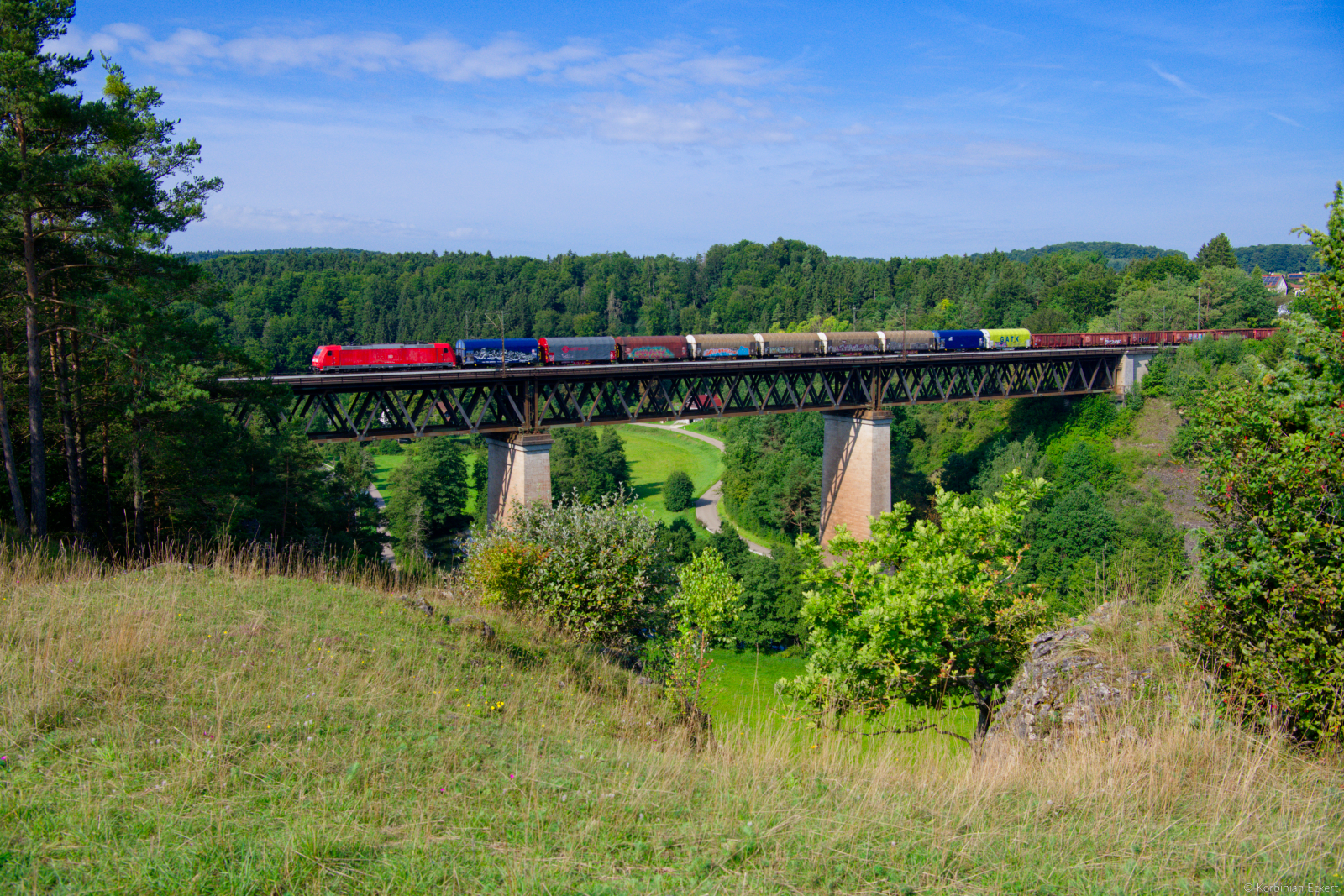 Hinter der Zugbezeichnung GAG 42996 verbirgt sich ein Neuwagentransport von Trnava in der Slowakei nach Aachen. Ladegut sind Fahrzeuge des Typs Land Rover Discovery. Am 06. April 2025 konnte ich diesen Zug, geführt von 185 295, bei Kerschhofen in der Oberpfalz dokumentieren. Christoph Schneider