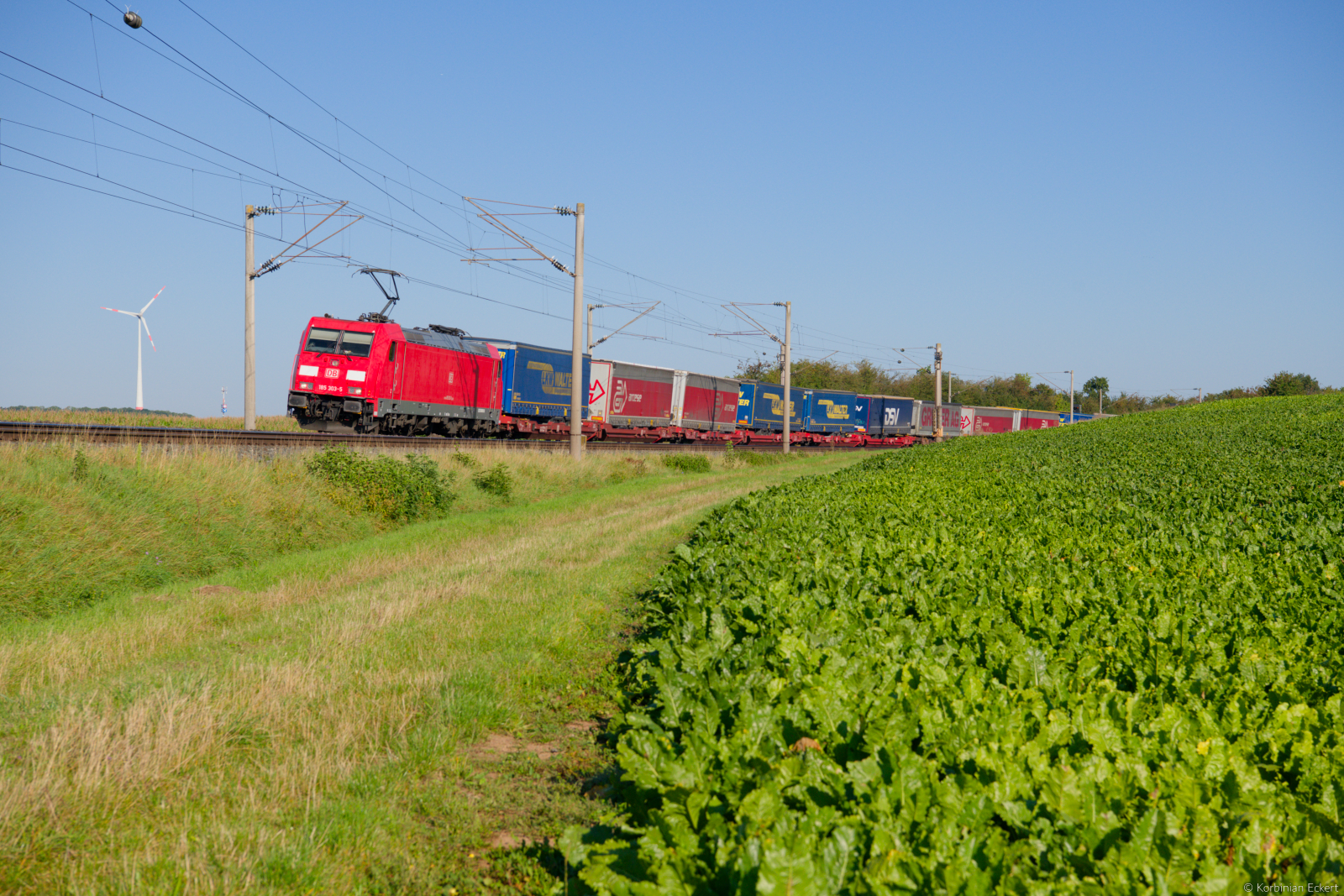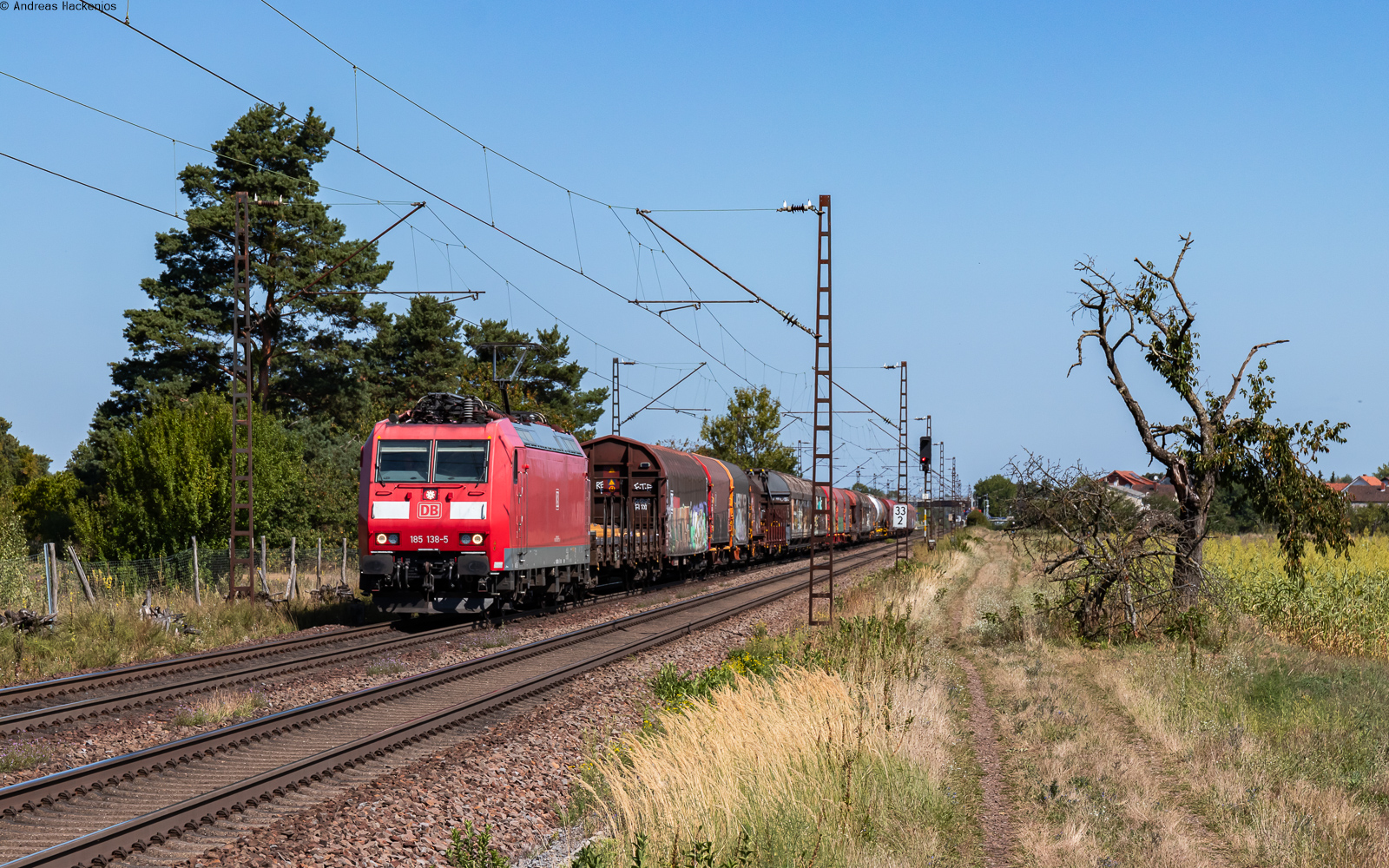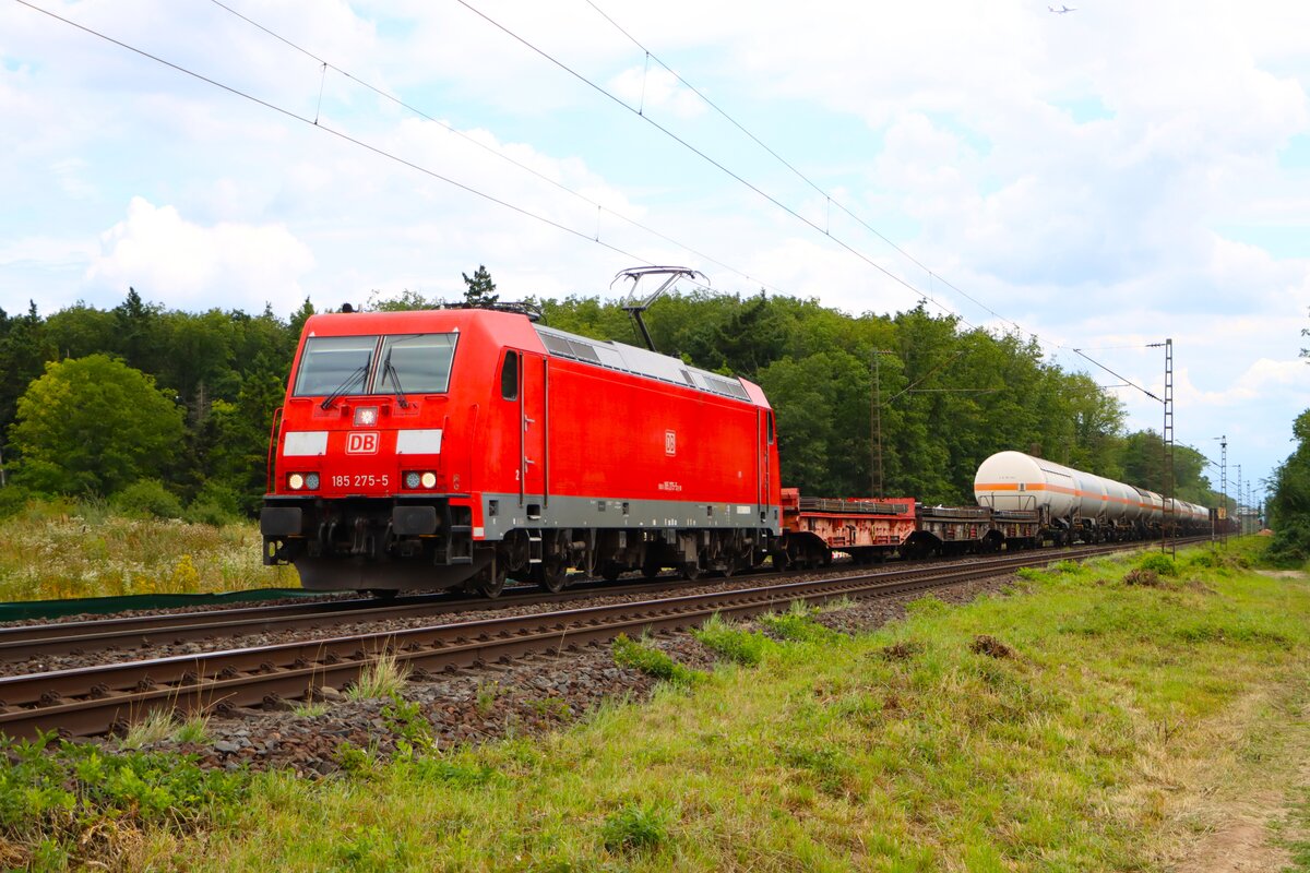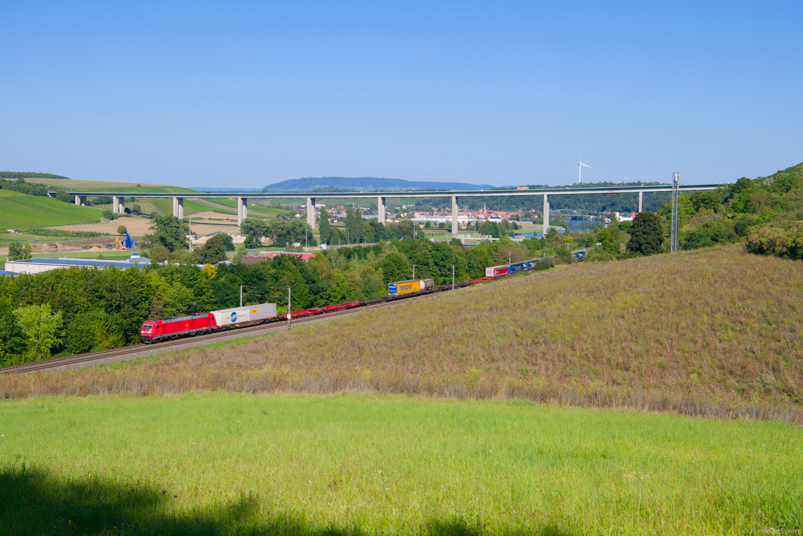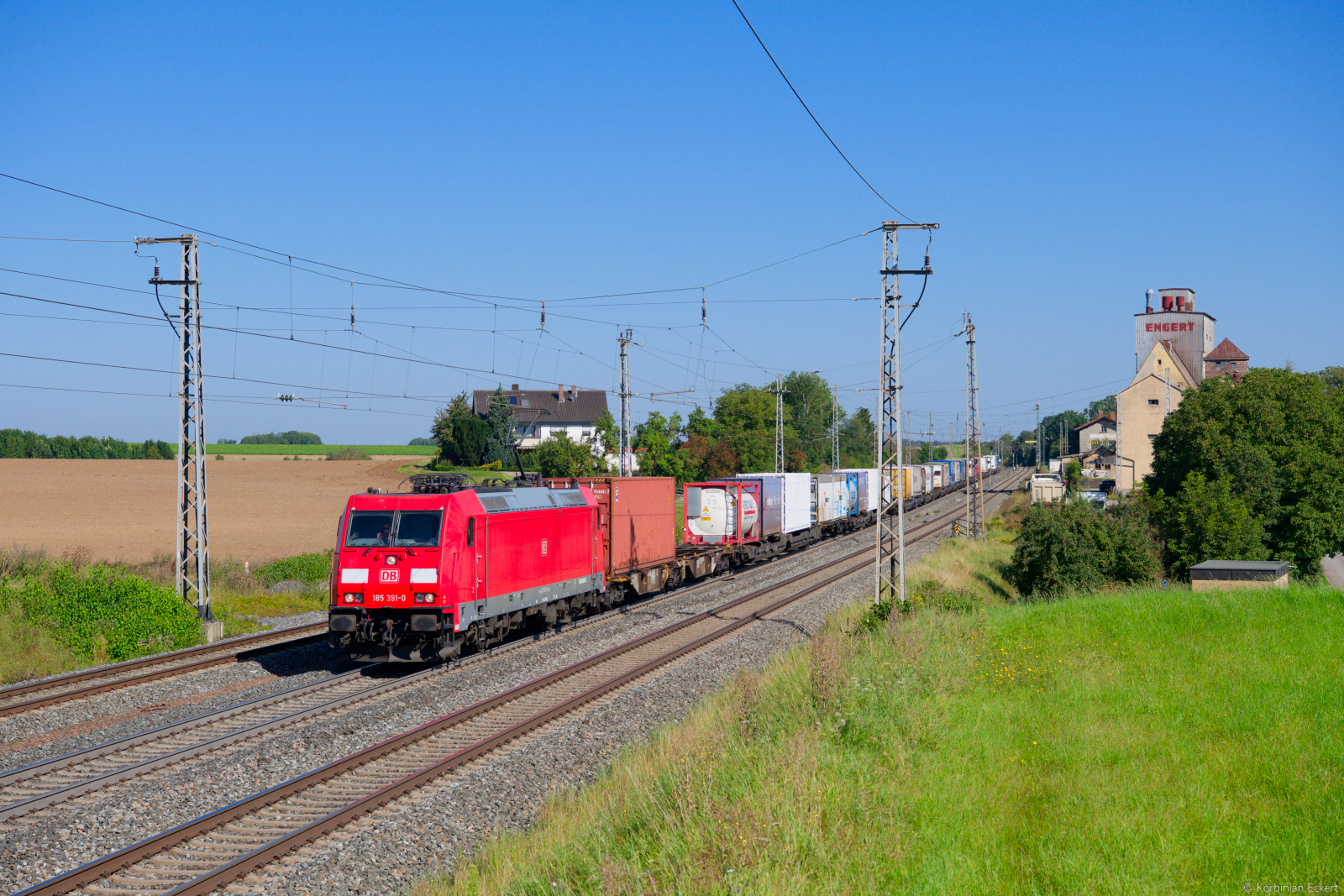 Eine unbekannt gebliebene 185.1 von DB Cargo mit einem gemischten Güterzug bei Marktbreit Richtung Würzburg, 03.09.2021
